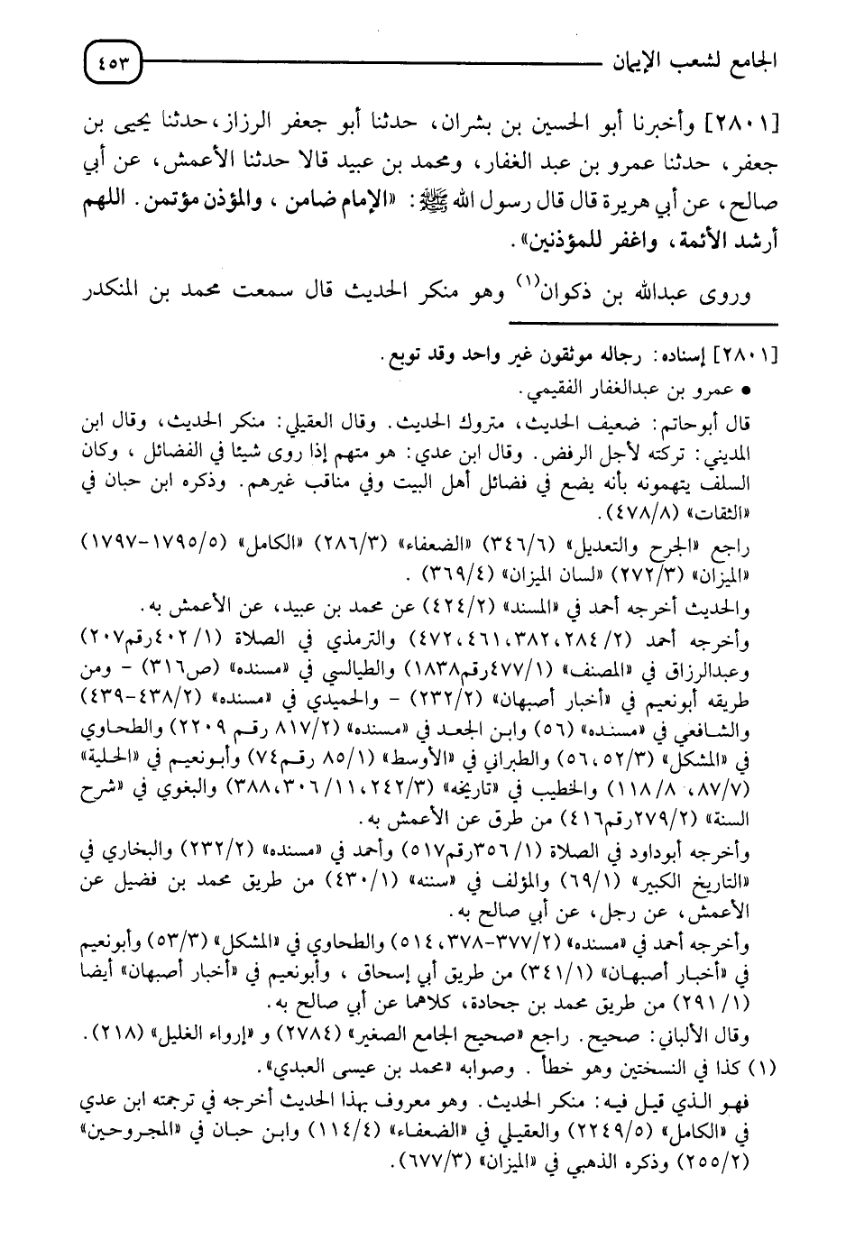 2801 - وأَخْبَرَنَا أَبُو الْحُسَيْنِ بْنُ بِشْرانَ، حَدَّثَنَا أَبُو جَعْفَرٍ الرَّزَّازُ، حَدَّثَنَا يَحْيَى بْنُ جَعْفَرٍ، حَدَّثَنَا عَمْرُو بْنُ عَبْدِ الْغَفَّارِ، وَمُحَمَّدُ بْنُ عُبَيْدٍ، قَالَا: حَدَّثَنَا الْأَعْمَشُ، عَنْ أَبِي صَالِحٍ، عَنْ أَبِي هُرَيْرَةَ، قَالَ: قَالَ رَسُولُ اللهِ صَلَّى اللَّهُ عَلَيْهِ وَسَلَّمَ: " §الْإِمَامُ ضَامِنٌ وَالْمُؤَذِّنُ مُؤْتَمَنٌ، اللهُمَّ أَرْشِدِ الْأَئِمَّةَ، وَاغْفِرْ لِلْمُؤَذِّنِينَ "