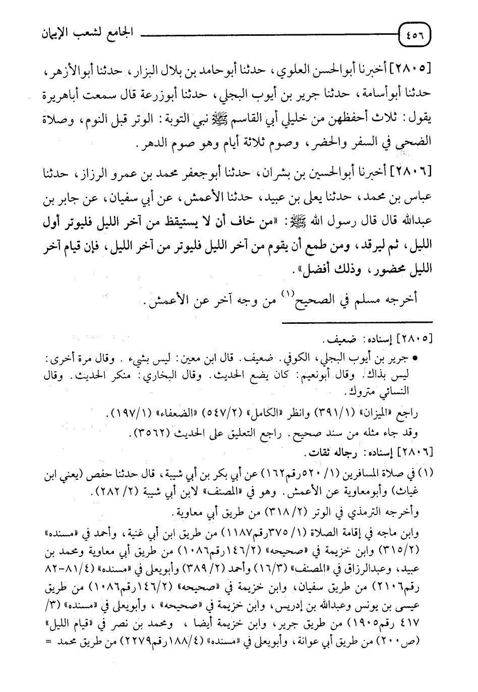 2806 - أَخْبَرَنَا أَبُو الْحُسَيْنِ بْنُ بِشْرانَ، حَدَّثَنَا أَبُو جَعْفَرٍ مُحَمَّدُ بْنُ عَمْرٍو الرَّزَّازُ، حَدَّثَنَا عَبَّاسُ بْنُ مُحَمَّدٍ، حَدَّثَنَا يَعْلَى بْنُ عُبَيْدٍ، حَدَّثَنَا الْأَعْمَشُ، عَنْ أَبِي سُفْيَانَ، عَنْ جَابِرِ بْنِ عَبْدِ اللهِ، قَالَ: قَالَ رَسُولُ اللهِ صَلَّى اللَّهُ عَلَيْهِ وَسَلَّمَ: §" مَنْ خَافَ أَنْ لَا يَسْتَيْقِظَ مِنْ آخِرِ اللَّيْلِ فَلْيُوتِرْ أَوَّلَ اللَّيْلِ ثُمَّ لْيَرْقُدْ، وَمَنْ طَمِعَ أَنْ يَقُومَ مِنْ آخِرِ اللَّيْلِ فَلْيُوتِرْ مِنْ آخِرِ اللَّيْلِ، فَإِنَّ قِيَامَ آخِرِ اللَّيْلِ مَحْضُورٌ وَذَلِكَ أَفْضَلُ " أَخْرَجَهُ مُسْلِمٌ فِي الصَّحِيحِ مِنْ وَجْهٍ آخَرَ، عَنِ الْأَعْمَشِ