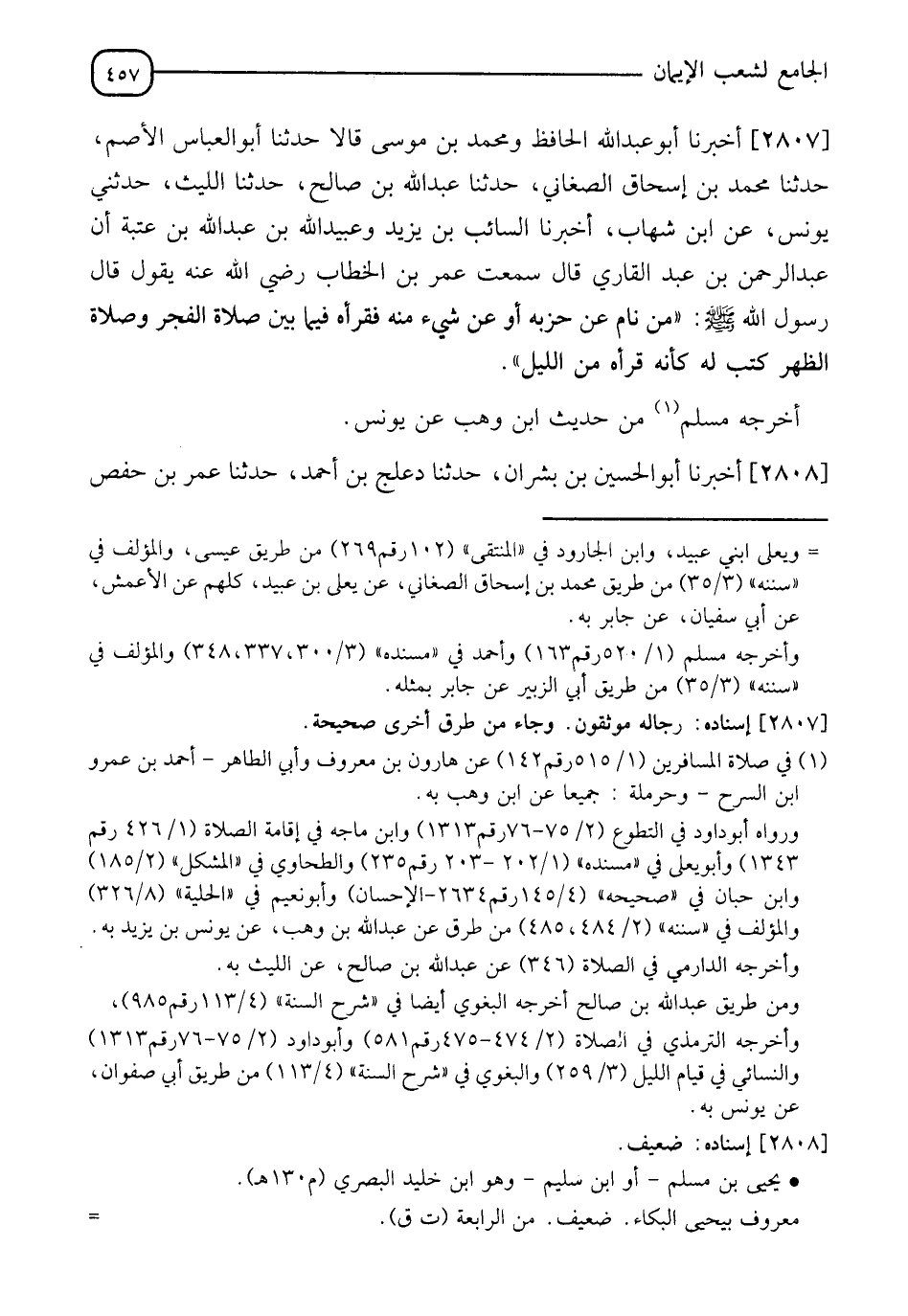 2807 - أَخْبَرَنَا أَبُو عَبْدِ اللهِ الْحَافِظُ، وَمُحَمَّدُ بْنُ مُوسَى، قَالَا: حَدَّثَنَا أَبُو الْعَبَّاسِ الْأَصَمُّ، حَدَّثَنَا مُحَمَّدُ بْنُ إِسْحَاقَ الصغَانِيُّ، حَدَّثَنَا عَبْدُ اللهِ بْنُ صَالِحٍ، حَدَّثَنَا اللَّيْثُ، حَدَّثَنِي يُونُسُ، عَنِ ابْنِ شِهَابٍ، أَخْبَرَنا السَّائِبُ بْنُ يَزِيدَ، وَعُبَيْدُ اللهِ بْنُ عَبْدِ اللهِ بْنِ عُتْبَةَ، أَنَّ عَبْدَ الرَّحْمَنِ بْنَ عَبْدٍ الْقَارِئُ، قَالَ: سَمِعْتُ عُمَرَ بْنَ الْخَطَّابِ، رَضِيَ اللهُ عَنْهُ يَقُولُ: قَالَ رَسُولُ اللهِ صَلَّى اللَّهُ عَلَيْهِ وَسَلَّمَ: §" مَنْ نَامَ عَنْ حِزْبِهِ أَوْ عَنْ شَيْءٍ مِنْهُ فَقَرَأَهُ فِيمَا بَيْنَ صَلَاةِ الْفَجْرِ وَصَلَاةِ الظُّهْرِ كُتِبَ لَهُ كَأَنَّمَا قَرَأَهُ مِنَ اللَّيْلِ " أَخْرَجَهُ مُسْلِمٌ مِنْ حَدِيثِ ابْنِ وَهْبٍ، عَنْ يُونُسَ