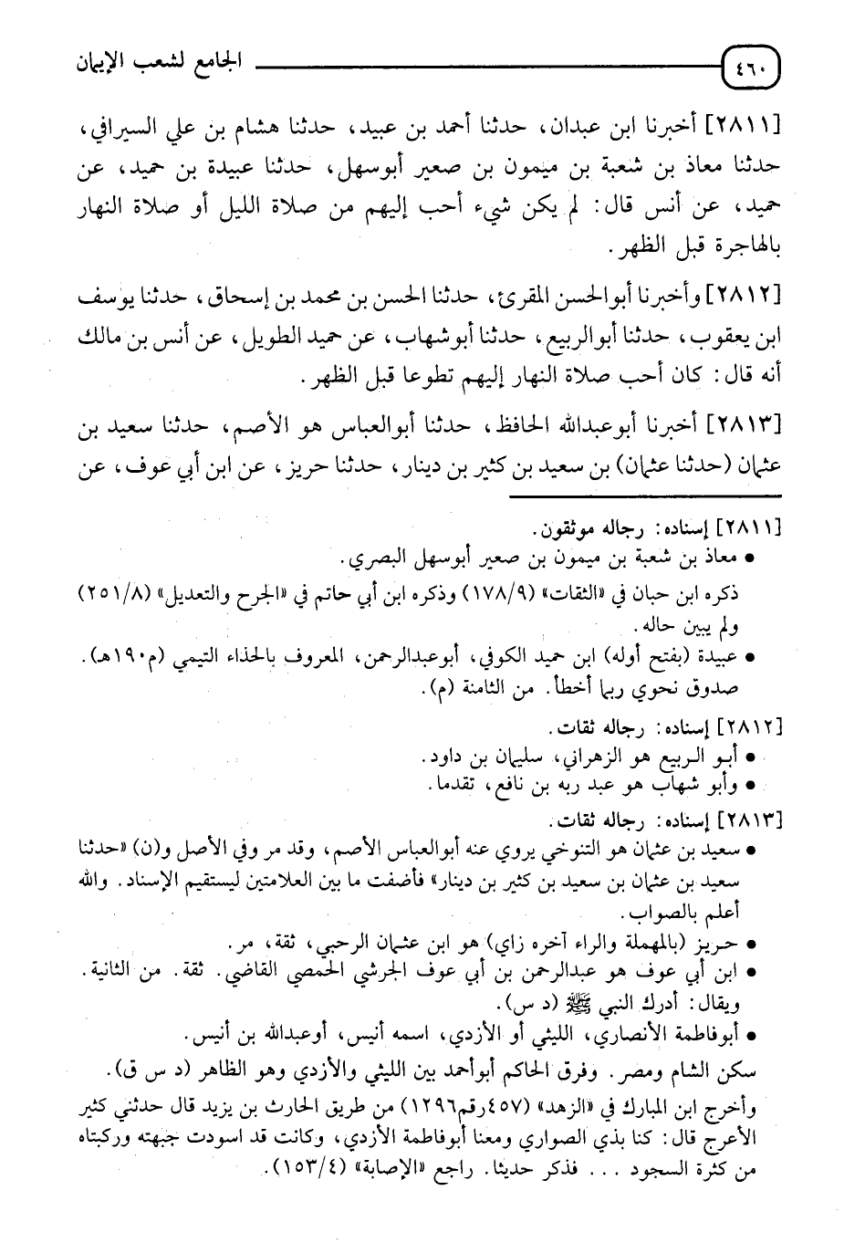 2811 - أَخْبَرَنَا ابْنُ عَبْدَانَ، حَدَّثَنَا أَحْمَدُ بْنُ عُبَيْدٍ، حَدَّثَنَا هِشَامُ بْنُ عَلِيٍّ السِّيرافِيُّ، حَدَّثَنَا مُعَاذُ بْنُ شُعْبَةَ بْنِ مَيْمُونِ بْنِ صُعَيْرٍ أَبُو سَهْلٍ، حَدَّثَنَا عَبِيدَةُ بْنُ حُمَيْدٍ، عَنْ حُمَيْدٍ، عَنْ أَنَسٍ، قَالَ: §" لَمْ يَكُنْ شَيْءٌ أَحَبُّ إِلَيْهِمْ مِنْ صَلَاةِ اللَّيْلِ أَوْ صَلَاةِ النَّهَارِ بِالْهَاجِرَةِ قَبْلَ الظُّهْرِ "