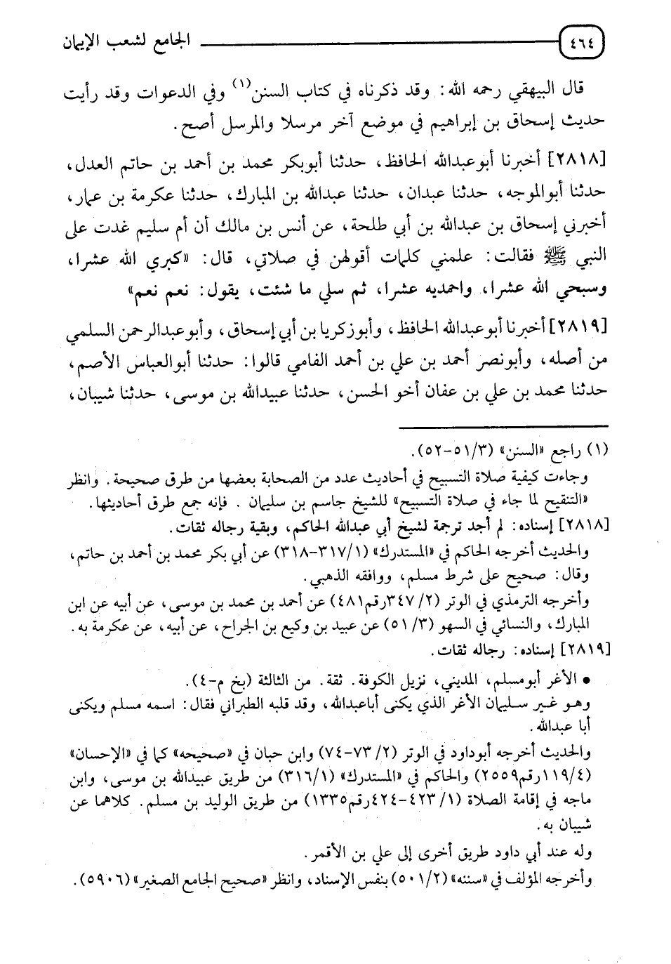 2818 - أَخْبَرَنَا أَبُو عَبْدِ اللهِ الْحَافِظُ، حَدَّثَنَا أَبُو بَكْرٍ مُحَمَّدُ بْنُ أَحْمَدَ بْنِ حَاتِمٍ الْعَدْلُ، حَدَّثَنَا أَبُو الْمُوَجَّهِ، حَدَّثَنَا عَبْدَانُ، حَدَّثَنَا عَبْدُ اللهِ بْنُ الْمُبَارَكِ، حَدَّثَنَا عِكْرِمَةُ بْنُ عَمَّارٍ، أَخْبَرَنِي إِسْحَاقُ بْنُ عَبْدِ اللهِ بْنِ أَبِي طَلْحَةَ، عَنْ أَنَسِ بْنِ مَالِكٍ، أَنَّ أُمَّ سُلَيْمٍ، غَدَتْ عَلَى النَّبِيِّ صَلَّى اللَّهُ عَلَيْهِ وَسَلَّمَ فَقَالَتْ: عَلِّمْنِي كَلِمَاتٍ أَقُولُهُنَّ فِي صَلَاتِي قَالَ: " §كَبِّرِي اللهَ عَشْرًا، وَسَبِّحِي اللهَ عَشْرًا، وَاحْمَدِيهِ عَشْرًا، ثُمَّ سَلِي مَا شِئْتِ يَقُولُ: نَعَمْ نَعَمْ "