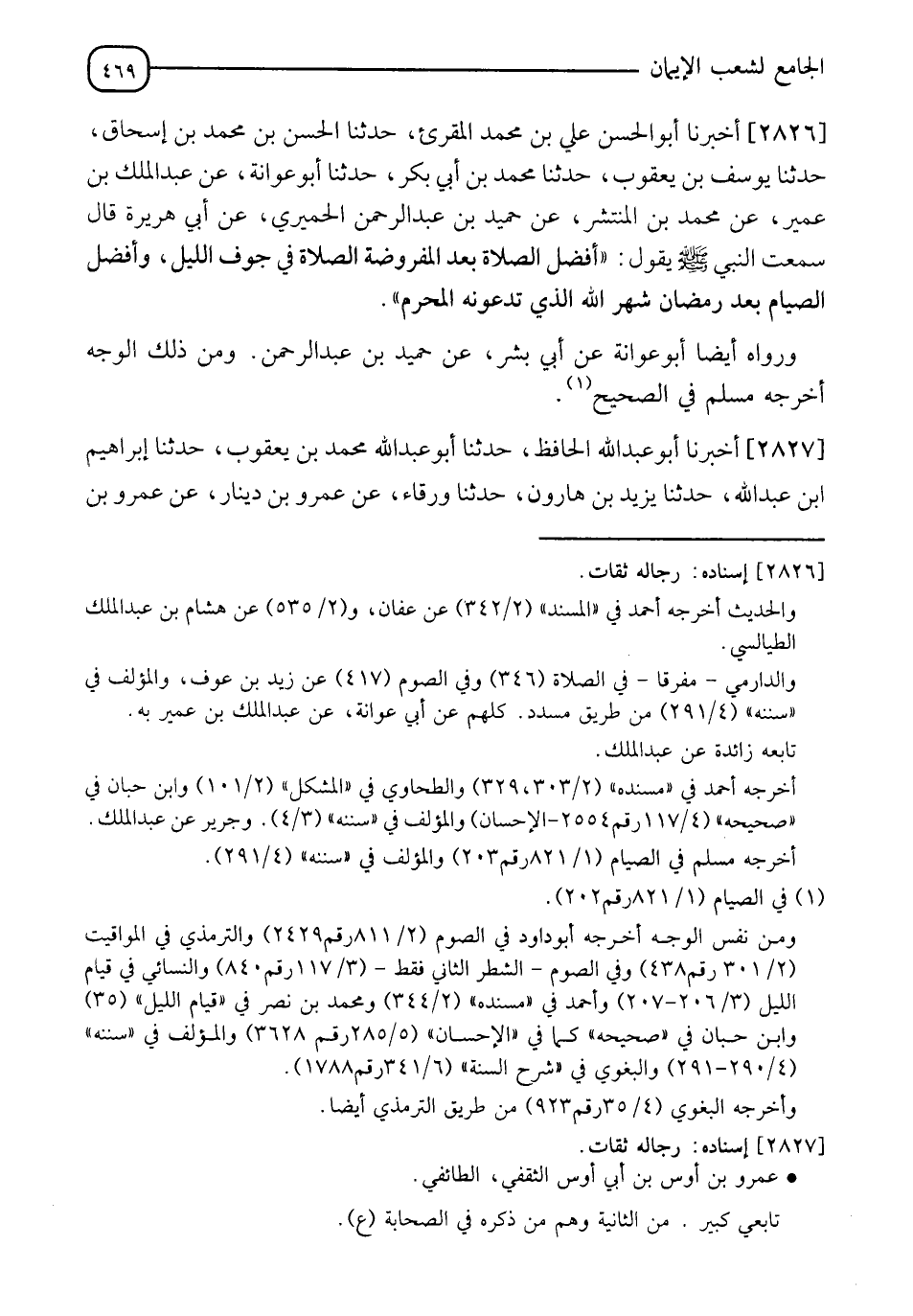 2826 - أَخْبَرَنَا أَبُو الْحَسَنِ عَلِيُّ بْنُ مُحَمَّدٍ الْمُقْرِئُ، حَدَّثَنَا الحسن بْنُ مُحَمَّدِ بْنِ إِسْحَاقَ، حَدَّثَنَا يُوسُفُ بْنُ يَعْقُوبَ، حَدَّثَنَا مُحَمَّدُ بْنُ أَبِي بَكْرٍ، حَدَّثَنَا أَبُو عَوَانَةَ، عَنْ عَبْدِ الْمَلِكِ بْنِ عُمَيْرٍ، عَنْ مُحَمَّدِ بْنِ الْمُنْتَشِرِ، عَنْ حُمَيْدِ بْنِ عَبْدِ الرَّحْمَنِ الْحِمْيَرِيِّ، عَنْ أَبِي هُرَيْرَةَ، قَالَ: سَمِعْتُ النَّبِيَّ صَلَّى اللَّهُ عَلَيْهِ وَسَلَّمَ يَقُولُ: " §أَفْضَلُ الصَّلَاةِ بَعْدَ الْمَفْرُوضَةِ الصَّلَاةُ في جَوْفِ اللَّيْلِ، وَأَفْضَلُ الصِّيَامِ بَعْدَ رَمَضَانَ شَهْرُ اللهِ الَّذِي تَدْعُونَهُ الْمُحَرَّمَ " وَرَوَاهُ أَيْضًا أَبُو عَوَانَةَ، عَنْ أَبِي بِشْرٍ، عَنْ حُمَيْدِ بْنِ عَبْدِ الرَّحْمَنِ وَمَنْ ذَلِكَ الْوَجْهِ أَخْرَجَهُ مُسْلِمٌ فِي الصَّحِيحِ