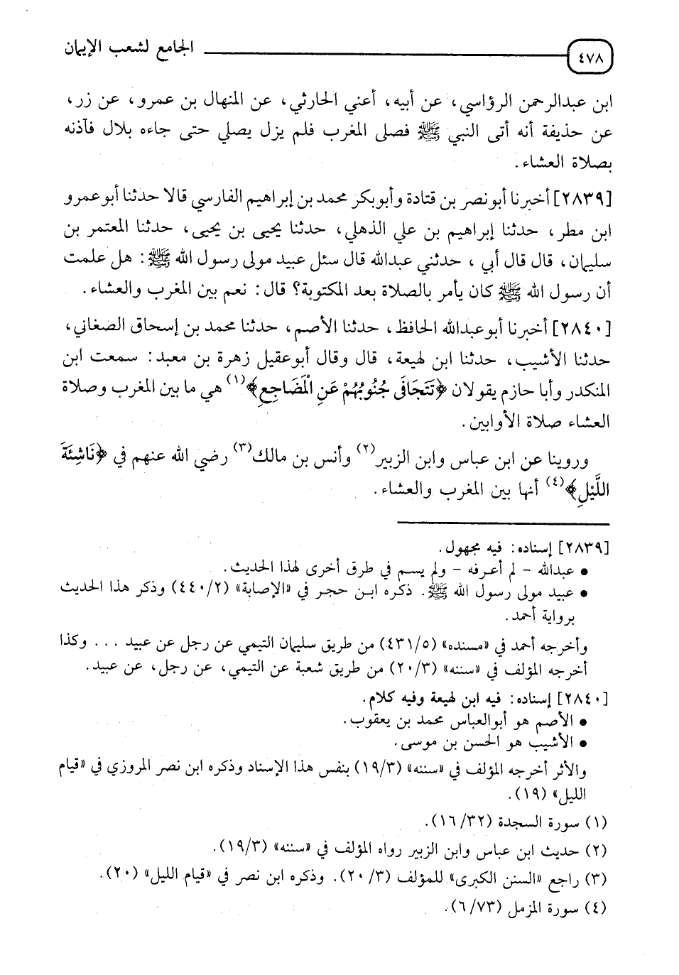 2840 - أَخْبَرَنَا أَبُو عَبْدِ اللهِ الْحَافِظُ، حَدَّثَنَا الْأَصَمُّ حَدَّثَنَا مُحَمَّدُ بْنُ إِسْحَاقَ الصغانِيُّ، حَدَّثَنَا الْأَشْيبُ، حَدَّثَنَا ابْنُ لَهِيعَةَ، قَالَ: وَقَالَ أَبُو عُقَيْلٍ زُهْرَةُ بْنُ مَعْبَدٍ: سَمِعْتُ ابْنَ الْمُنْكَدِرِ، وَأَبَا حَازِمٍ يَقُولَانِ: {§تَتَجَافَى جُنُوبُهُمْ عَنِ الْمَضَاجِعِ} [السجدة: 16]، " هي مَا بَيْنَ الْمَغْرِبِ وَصَلَاةِ الْعِشَاءِ، صَلَاةُ الْأَوَّابِينَ " وَرُوِّينا عَنِ ابْنِ عَبَّاسٍ، وَابْنِ الزُّبَيْرِ، وَأَنَسِ بْنِ مَالِكٍ رَضِيَ اللهُ عَنْهُمْ " فِي نَاشِئَةِ اللَّيْلِ، أَنَّهَا بَيْنَ الْمَغْرِبِ وَالْعِشَاءِ " -[479]- وَكَانَ الْحَسَنُ: " لَا يُعِدُ ذَلِكَ فِي صَلَاةِ اللَّيْلِ حَتَّى يَنَامَ نَوْمَةً ثُمَّ يَقُومُ "