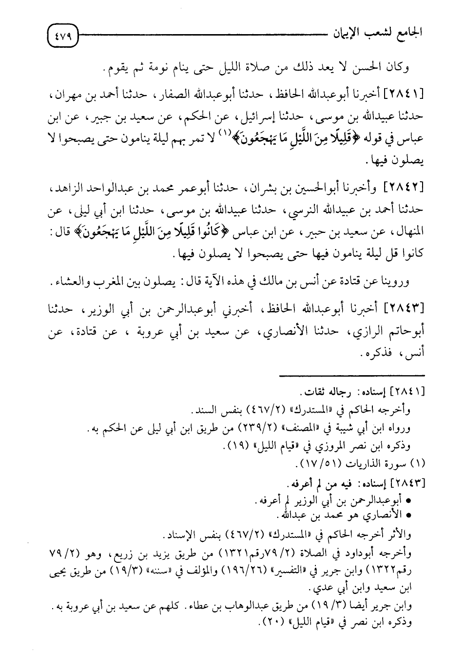 2841 - أَخْبَرَنَا أَبُو عَبْدِ اللهِ الْحَافِظُ، حَدَّثَنَا أَبُو عَبْدِ اللهِ الصَّفَّارُ، حَدَّثَنَا أَحْمَدُ بْنُ مِهْرَانَ، حَدَّثَنَا عُبَيْدُ اللهِ بْنُ مُوسَى، حَدَّثَنَا إِسْرَائِيلُ، عَنِ الْحَكَمِ، عَنْ سَعِيدِ بْنِ جُبَيْرٍ، عَنِ ابْنِ عَبَّاسٍ، فِي قَوْلِهِ: {§كَانُوا قَلِيلًا مِنَ اللَّيْلِ مَا يَهْجَعُونَ} [الذاريات: 17]، " لَا تَمُرُّ بِهِمْ لَيْلَةٌ يَنَامُونَ حَتَّى يُصْبِحُوا لَا يُصَلُّونَ فِيهَا "