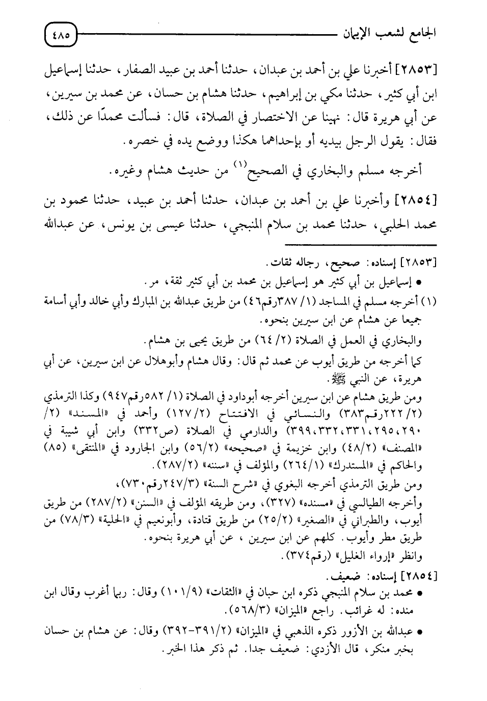 2853 - أَخْبَرَنَا عَلِيُّ بْنُ أَحْمَدَ بْنِ عَبْدَانَ، حَدَّثَنَا أَحْمَدُ بْنُ عُبَيْدٍ الصَّفَّارُ، حَدَّثَنَا إِسْمَاعِيلُ بْنُ أَبِي كَثِيرٍ، حَدَّثَنَا مَكِّيُّ بْنُ إِبْرَاهِيمَ، حَدَّثَنَا هِشَامُ بْنُ حَسَّانَ، عَنْ مُحَمَّدِ بْنِ سِيرِينَ، عَنْ أَبِي هُرَيْرَةَ، قَالَ: §نُهِينَا عَنِ الِاخْتِصَارِ فِي الصَّلَاةِ قَالَ: فَسَأَلْتُ مُحَمَّدًا عَنْ ذَلِكَ، فَقَالَ: " يَقُولُ الرَّجُلُ بِيَدَيْهِ أَوْ بِإِحْدَاهُمَا هَكَذَا وَوَضَعَ يَدَهُ فِي خَصْرِهِ " أَخْرَجَهُ مُسْلِمٌ وَالْبُخارِيُّ فِي الصَّحِيحِ مِنْ حَدِيثِ هِشَامٍ وَغَيْرِهِ