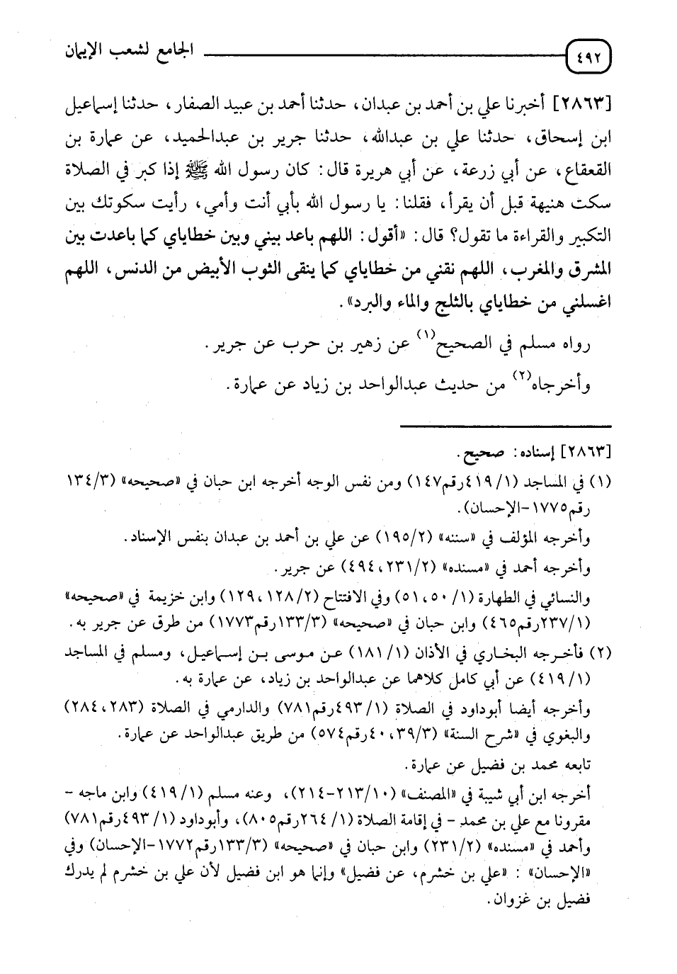 2863 - أَخْبَرَنَا عَلِيُّ بْنُ أَحْمَدَ بْنِ عَبْدَانَ، حَدَّثَنَا أَحْمَدُ بْنُ عُبَيْدٍ الصَّفَّارُ، حَدَّثَنَا إِسْمَاعِيلُ بْنُ إِسْحَاقَ، حَدَّثَنَا عَلِيُّ بْنُ عَبْدِ اللهِ، حَدَّثَنَا جَرِيرُ بْنُ عَبْدِ الْحَمِيدِ، عَنْ عُمَارَةَ بْنِ الْقَعْقَاعِ، عَنْ أَبِي زُرْعَةَ، عَنْ أَبِي هُرَيْرَةَ، قَالَ: كَانَ رَسُولُ اللهِ صَلَّى اللَّهُ عَلَيْهِ وَسَلَّمَ إِذَا كَبَّرَ فِي الصَّلَاةِ سَكَتَ هُنَيَّةً قَبْلَ أَنْ يَقْرَأَ فقُلْنا يَا رَسُولَ اللهِ بِأَبِي أَنْتَ وَأُمِّي رَأَيْتَ سُكُوتَكَ بَيْنَ التَّكْبِيرِ وَالْقِرَاءَةِ مَا تَقُولُ؟ قَالَ: " أَقُولُ §اللهُمَّ بَاعِدْ بَيْنِي وَبَيْنَ خَطَايَايَ كَمَا بَاعَدْتَ بَيْنَ الْمَشْرِقِ وَالْمَغْرِبِ، اللهُمَّ نَقِّنِي مِنْ خَطَايَايَ كَمَا يُنَقَّى الثَّوْبُ الْأَبْيَضُ مِنَ الدَّنَسِ، اللهُمَّ اغْسِلْنِي مِنْ خَطَايَايَ بِالثَّلْجِ وَالْمَاءِ وَالْبَرَدِ " رَوَاهُ مُسْلِمٌ فِي الصَّحِيحِ، عَنْ زُهَيْرِ بْنِ حَرْبٍ، عَنْ جَرِيرٍ وَأَخْرَجاهُ مِنْ حَدِيثِ عَبْدِ الْوَاحِدِ بْنِ زِيَادٍ عَنْ عُمَارَةَ