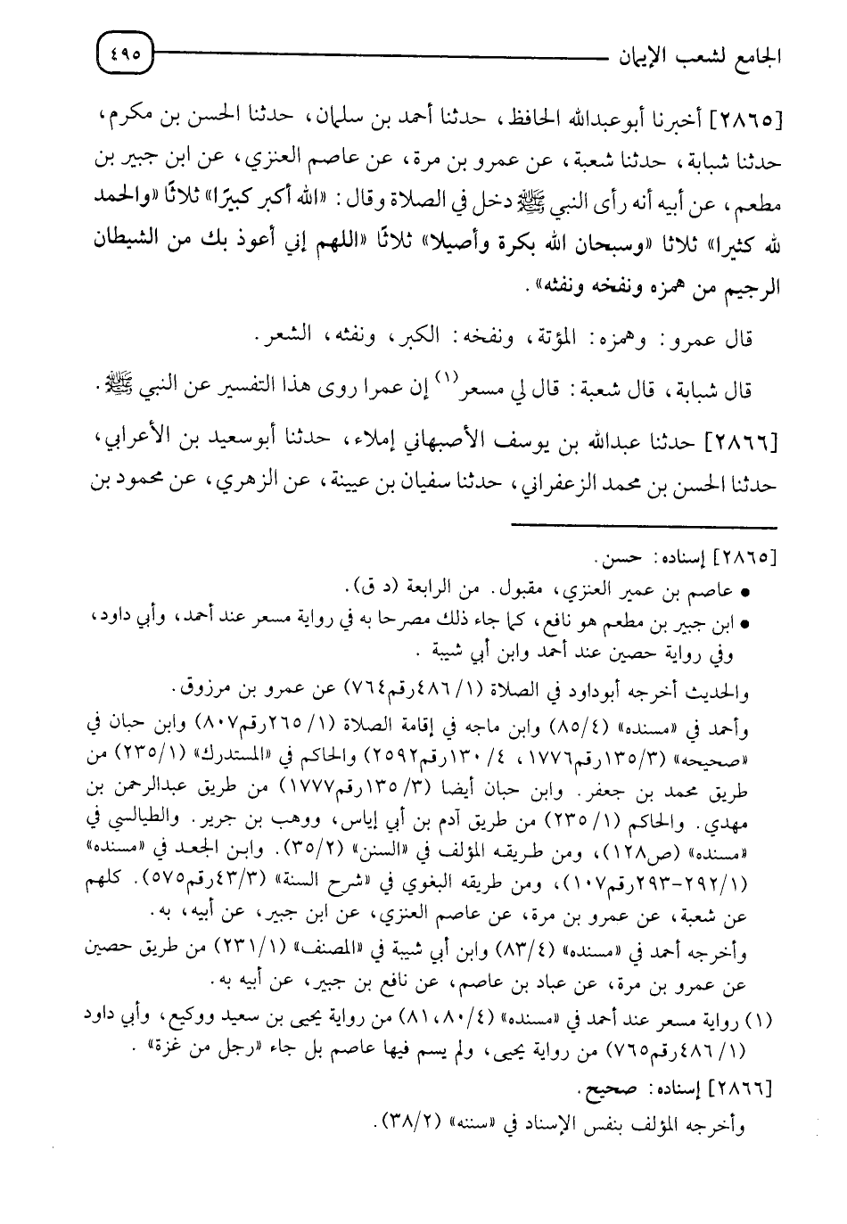 2865 - أَخْبَرَنَا أَبُو عَبْدِ اللهِ الْحَافِظُ، حَدَّثَنَا أَحْمَدُ بْنُ سَلْمَانَ، حَدَّثَنَا الْحَسَنُ بْنُ مُكْرَمٍ، حَدَّثَنَا شَبَابَةُ، حَدَّثَنَا شُعْبَةُ، عَنْ عَمْرِو بْنِ مُرَّةَ، عَنْ عَاصِمٍ الْعَنَزِيِّ، عَنِ ابْنِ جُبَيْرِ بْنِ مُطْعِمٍ، عَنْ أَبِيهِ، أَنَّهُ رَأَى النَّبِيَّ صَلَّى اللَّهُ عَلَيْهِ وَسَلَّمَ دَخَلَ فِي الصَّلَاةِ وَقَالَ: " §اللهُ أَكْبَرُ كَبِيرًا ثَلَاثًا، وَالْحَمْدُ لِلَّهِ كَثِيرًا ثَلَاثًا، وَسُبْحَانَ اللهِ بُكْرَةً وَأَصِيلًا ثَلَاثًا، اللهُمَّ إِنِّي أَعُوذُ بِكَ مِنَ الشَّيْطَانِ الرَّجِيمِ، مِنْ هَمْزِهِ وَنَفْخِهِ وَنَفْثِهِ " قَالَ عَمْرٌو: وَهَمْزُهُ: الْمَوْتَةُ، وَنَفْخُهُ: الْكِبْرُ، وَنَفْثُهُ: الشِّعْرُ قَالَ شَبَابَةُ: قَالَ شُعْبَةُ: قَالَ لِي مِسْعَرٌ أنَّ عَمْرًا رَوَى هَذَا التَّفْسِيرَ، عَنِ النَّبِيِّ صَلَّى اللَّهُ عَلَيْهِ وَسَلَّمَ