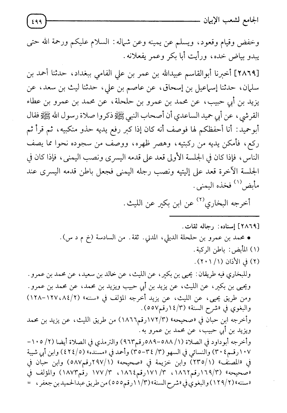 2869 - أَخْبَرَنَا أَبُو الْقَاسِمِ عُبَيْدُ اللهِ بْنُ عُمَرَ بْنِ عَلِيٍّ الْفَامِي، بِبَغْدَادَ، حَدَّثَنَا أَحْمَدُ بْنُ سَلْمَانَ، حَدَّثَنَا إِسْمَاعِيلُ بْنُ إِسْحَاقَ، عَنْ عَاصِمِ بْنِ عَلِيٍّ، حَدَّثَنَا لَيْثُ بْنُ سَعْدٍ، عَنْ يَزِيدَ بْنِ أَبِي حَبِيبٍ، عَنْ مُحَمَّدِ بْنِ عَمْرِو بْنِ حَلْحَلَةَ، عَنْ مُحَمَّدِ بْنِ عَمْرِو بْنِ عَطَاءٍ الْقُرَشِيِّ، عَنْ أَبِي حُمَيْدٍ السَّاعِدِيِّ، أَنَّ أَصْحَابَ النَّبِيِّ صَلَّى اللَّهُ عَلَيْهِ وَسَلَّمَ ذَكَرُوا صَلَاةَ رَسُولِ اللهِ صَلَّى اللَّهُ عَلَيْهِ وَسَلَّمَ فَقَالَ أَبُو حُمَيْدٍ أَنَا أَحْفَظُكُمْ لَهَا فَوَصَفَ: " أَنَّهُ كَانَ §إِذَا كَبَّرَ رَفَعَ يَدَيْهِ حَذْوَ مَنْكِبَيْهِ، ثُمَّ قَرَأَ، ثُمَّ رَكَعَ فَأَمْكَنَ يَدَيْهِ مِنْ رُكْبَتَيْهِ وَهَصَرَ ظَهْرَهُ، وَوَصَفَ مِنْ سُجُودِهِ نَحْوًا مِمَّا يَصِفُ النَّاسُ فَإِذَا كَانَ فِي الْجَلْسَةِ الْأُولَى قَعَدَ عَلَى قَدَمِهِ الْيُسْرَى وَنَصَبَ الْيُمْنَى، فَإِذَا كَانَ فِي الْجَلْسَةِ الْآخِرَةِ قَعَدَ عَلَى أَلْيَتِهِ وَنَصَبَ رِجْلَهُ الْيُمْنَى، فَجَعَلَ بَاطِنَ قَدَمِهِ الْيُسْرَى عِنْدَ مأبض فَخِذِهِ الْيُمْنَى " أَخْرَجَهُ الْبُخَارِيُّ عَنْ ابن بُكَيْرٍ، عَنِ اللَّيْثِ