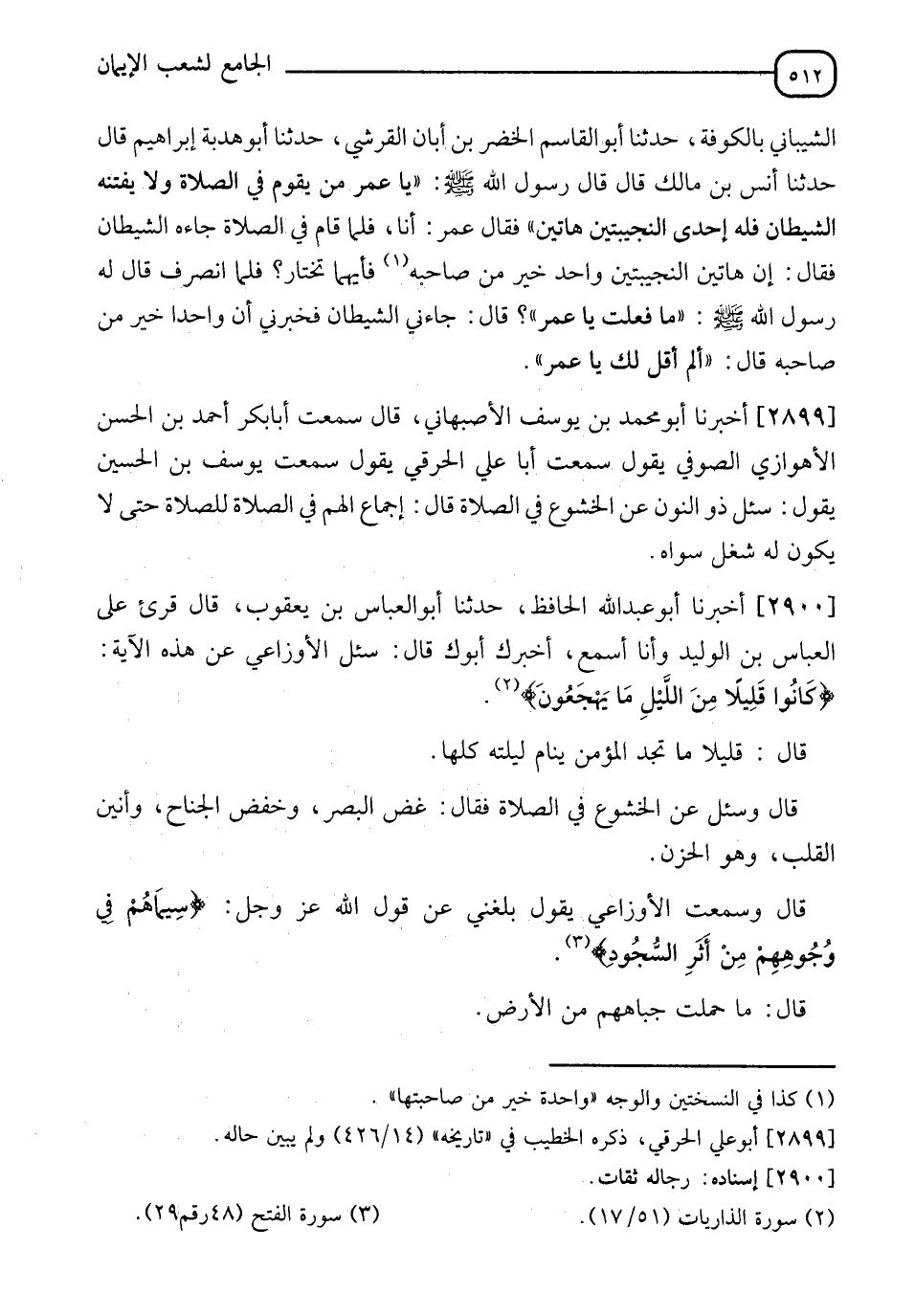 2900 - أَخْبَرَنَا أَبُو عَبْدِ اللهِ الْحَافِظُ، حَدَّثَنَا أَبُو الْعَبَّاسِ بْنُ يَعْقُوبَ، قَالَ: قُرِئَ عَلَى الْعَبَّاسِ بْنِ الْوَلِيدِ وَأَنَا أَسْمَعُ، أَخْبَرَكَ أَبُوكَ، قَالَ: سُئِلَ الْأَوْزَاعِيَّ عَنْ هَذِهِ الْآيَةِ: {كَانُوا قَلِيلًا مِنَ اللَّيْلِ مَا يَهْجَعُونَ} [الذاريات: 17] قَالَ: " §قَلِيلًا مَا تَجِدُ الْمُؤْمِنَ يَنَامُ لَيْلَتَهُ كُلَّهَا "، قَالَ: وَسُئِلَ عَنِ الْخُشُوعِ فِي الصَّلَاةِ فقَالَ: " غَضُّ الْبَصَرِ، وَخَفْضُ الْجَنَاحِ، وَأَنِينُ الْقَلْبِ وَهُوَ الْحُزْنُ " قَالَ: وَسَمِعْتُ الْأَوْزَاعِيَّ يَقُولُ: " بَلَغَنِي عَنْ قَوْلِ اللهِ عَزَّ وَجَلَّ: {سِيمَاهُمْ فِي وُجُوهِهِمْ مِنْ أَثَرِ السُّجُودِ} [الفتح: 29] قَالَ: مَا حَمَلَتْ جِبَاهُهُمْ مِنَ الْأَرْضِ "