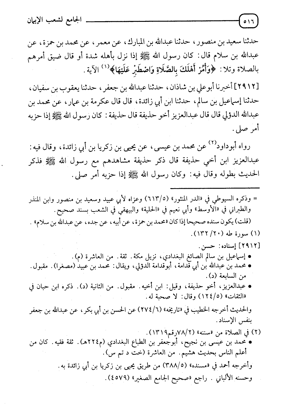 2912 - أَخْبَرَنا أَبُو عَلِيِّ بْنُ شَاذَانَ، حَدَّثَنَا عَبْدُ اللهِ بْنُ جَعْفَرٍ، حَدَّثَنَا يَعْقُوبُ بْنُ سُفْيَانَ، حَدَّثَنَا إِسْمَاعِيلُ بْنُ سَالِمٍ، حَدَّثَنَا ابْنُ أَبِي زَائِدَةَ، قَالَ: قَالَ عِكْرِمَةُ بْنُ عَمَّارٍ، عَنْ مُحَمَّدِ بْنِ عَبْدِ اللهِ الدُّؤَلِيِّ، قَالَ: قَالَ عَبْدُ الْعَزِيزِ أَخُو حُذَيْفَةَ: قَالَ حُذَيْفَةُ: " كَانَ رَسُولُ اللهِ صَلَّى اللَّهُ عَلَيْهِ وَسَلَّمَ §إِذَا حَزَبَهُ أَمْرٌ صَلَّى " رَوَاهُ أَبُو دَاوُدَ، عَنْ مُحَمَّدِ بْنِ عِيسَى، عَنْ يَحْيَى بْنِ زَكَرِيَّا بْنِ أَبِي زَائِدَةَ، وَقَالَ فِيهِ عَبْدُ الْعَزِيزِ ابْنُ أَخِي حُذَيْفَةَ، قَالَ: ذَكَرَ حُذَيْفَةُ مَشَاهِدَهُمْ مَعَ رَسُولِ اللهِ صَلَّى اللَّهُ عَلَيْهِ وَسَلَّمَ فَذَكَرَ الْحَدِيثَ بِطُولِهِ، وَقَالَ فِيهِ: " وَكَانَ رَسُولُ اللهِ صَلَّى اللَّهُ عَلَيْهِ وَسَلَّمَ إِذَا حَزَبَهُ أَمْرٌ صَلَّى "