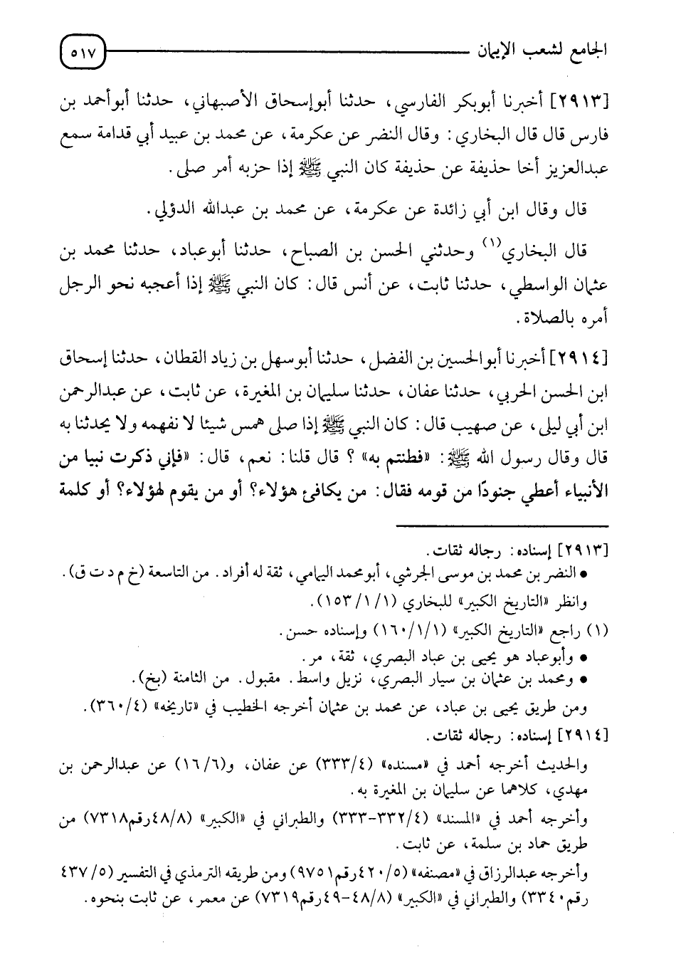 2913 - أَخْبَرَنَا أَبُو بَكْرٍ الْفَارِسِيُّ، حَدَّثَنَا أَبُو إِسْحَاقَ الْأَصْبَهَانِيُّ، حَدَّثَنَا أَبُو أَحْمَدَ بْنُ فَارِسٍ، قَالَ: قَالَ الْبُخَارِيُّ، وَقَالَ النَّضْرُ، عَنْ عِكْرِمَةَ، عَنْ مُحَمَّدِ بْنِ عُبَيْدٍ أَبِي قُدَامَةَ، سَمِعَ عَبْدَ الْعَزِيزِ، أَخَا حُذَيْفَةَ عَنْ حُذَيْفَةَ، " كَانَ النَّبِيُّ صَلَّى اللَّهُ عَلَيْهِ وَسَلَّمَ §إِذَا حَزَبَهُ أَمْرٌ صَلَّى "