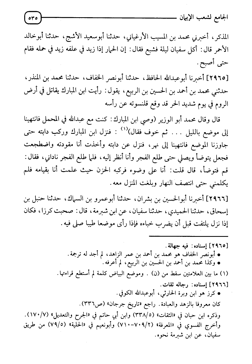 2965 - أَخْبَرَنَا أَبُو عَبْدِ اللهِ الْحَافِظُ، حَدَّثَنَا أَبُو نَصْرٍ الْخَفَّافُ، حَدَّثَنَا مُحَمَّدُ بْنُ الْمُنْذِرِ، حَدَّثَنِي مُحَمَّدُ بْنُ أَحْمَدَ بْنِ الْحُسَيْنِ بْنِ الرَّبِيعِ، يَقُولُ: " رَأَيْتُ ابْنَ الْمُبَارَكِ §يُقَاتِلُ في أَرْضِ الرُّومِ فِي يَوْمٍ شَدِيدِ الْحَرِّ، قَدْ وَقَعَ قُلْنُسْوَتُهُ عَنْ رَأْسِهِ "