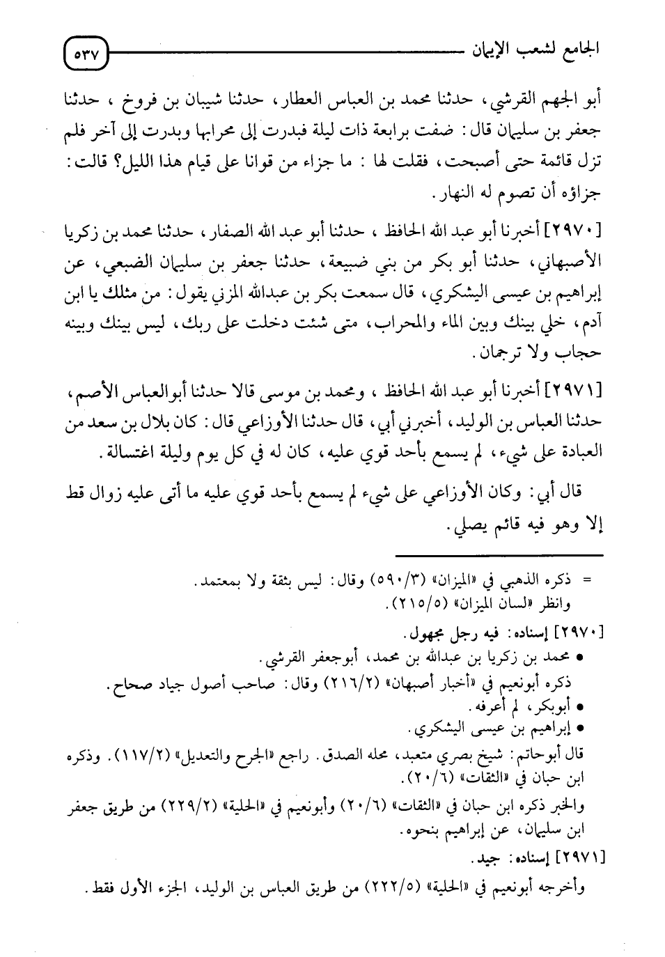 2971 - أَخْبَرَنَا أَبُو عَبْدِ اللهِ الْحَافِظُ، وَمُحَمَّدُ بْنُ مُوسَى، قَالَا: حَدَّثَنَا أَبُو الْعَبَّاسِ الْأَصَمُّ، حَدَّثَنَا الْعَبَّاسُ بْنُ الْوَلِيدِ، أَخْبَرَنِي أَبِي، قَالَ: حَدَّثَنَا الْأَوْزَاعِيُّ، قَالَ: " كَانَ بِلَالُ بْنُ سَعْدٍ مِنَ الْعِبَادَةِ عَلَى شَيْءٍ لَمْ يُسْمَعْ بِأَحَدٍ قَوِيَ عَلَيْهِ كَانَ §لَهُ فِي كُلِّ يَوْمٍ وَلَيْلَةٍ اغْتِسَالَةٌ "