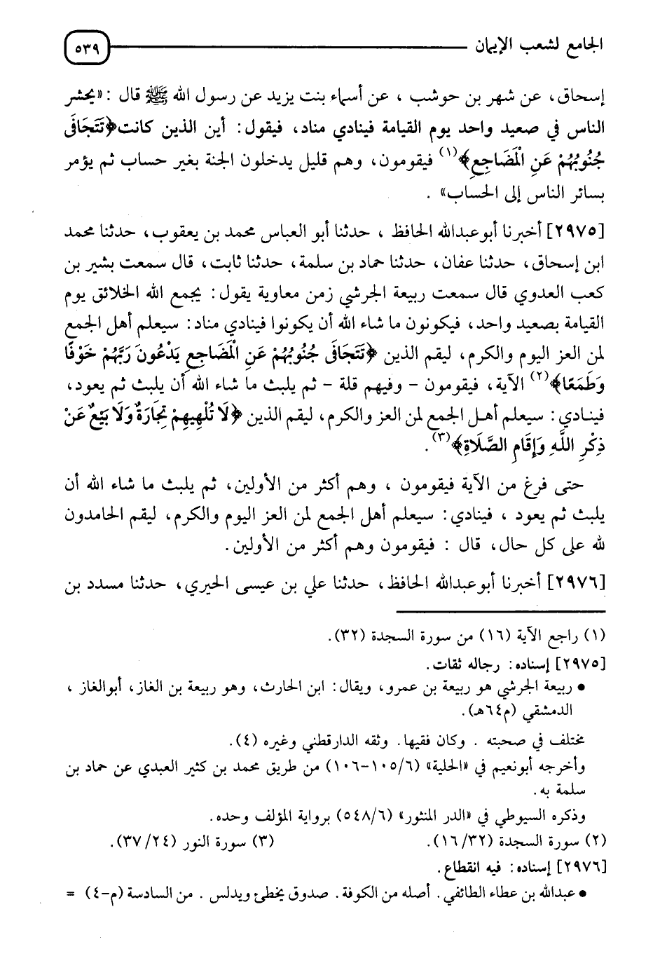 2975 - أَخْبَرَنَا أَبُو عَبْدِ اللهِ الْحَافِظُ، حَدَّثَنَا أَبُو الْعَبَّاسِ مُحَمَّدُ بْنُ يَعْقُوبَ، حَدَّثَنَا مُحَمَّدُ بْنُ إِسْحَاقَ، حَدَّثَنَا عَفَّانُ، حَدَّثَنَا حَمَّادُ بْنُ سَلَمَةَ، حَدَّثَنَا ثَابِتٌ، قَالَ: سَمِعْتُ بَشِيرَ بْنَ كَعْبٍ الْعَدَوِيَّ، قَالَ: سَمِعْتُ رَبِيعَةَ الْجَرَشِيَّ، زَمَنَ مُعَاوِيَةَ يَقُولُ: " §يَجْمَعُ اللهُ الْخَلَائِقَ يَوْمَ الْقِيَامَةِ بِصَعِيدٍ وَاحِدٍ، فَيَكُونُونَ مَا شَاءَ اللهُ أَنْ يَكُونُوا، فَيُنَادِي مُنَادٍ سَيَعْلَمُ أَهْلُ الْجَنَّةِ لِمَنِ الْعِزُّ الْيَوْمَ وَالْكَرَمُ لِيَقُمِ الَّذِينَ {تَتَجَافَى جُنُوبُهُمْ عَنِ الْمَضَاجِعِ يَدْعُونَ رَبَّهُمْ خَوْفًا وَطَمَعًا} [السجدة: 16] الْآيَةُ، فَيَقُومُونَ وَفِيهِمْ قِلَّةٌ، ثُمَّ يَلْبَثُ مَا شَاءَ اللهُ أَنْ يَلْبَثَ، ثُمَّ يَعُودُ فَيُنَادِي، سَيَعْلَمُ أَهْلُ الْجَمْعِ لِمَنِ الْعِزُّ وَالْكَرَمُ لِيَقُمِ الَّذِينَ {لَا تُلْهِيهِمْ تِجَارَةٌ وَلَا بَيْعٌ عَنْ ذِكْرِ اللهِ وَإِقَامِ الصَّلَاةِ} [النور: 37] حَتَّى فَرَغَ مِنَ الْآيَةِ، فَيَقُومُونَ وَهُمْ أَكْثَرُ مِنَ الْأَوَّلِينَ، ثُمَّ يَلْبَثُ مَا شَاءَ اللهُ أنْ يَلْبَثَ، ثُمَّ يَعُودُ فَيُنَادِي، سَيَعْلَمُ أَهْلُ الْجَمْعِ لِمَنِ الْعِزُّ الْيَوْمَ وَالْكَرَمُ، لِيَقُمِ الْحَامِدُونَ لِلَّهِ عَلَى كُلِّ حَالٍ، قَالَ: فَيَقُومُونَ وَهُمْ أَكْثَرُ مِنَ الْأَوَّلِينَ "