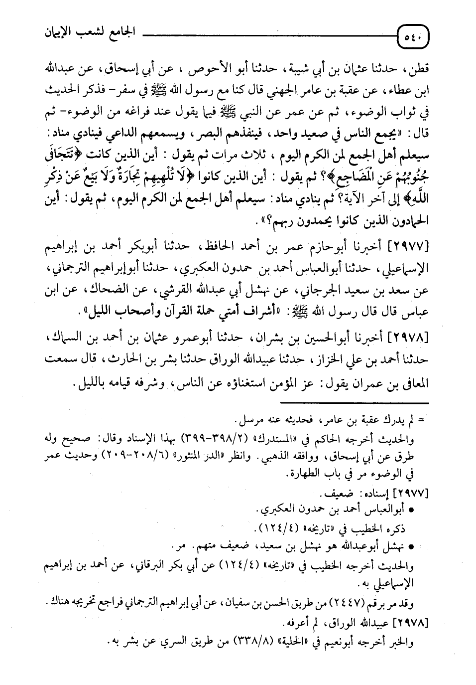 2977 - أَخْبَرَنَا أَبُو حَازِمٍ عُمَرُ بْنُ أَحْمَدَ الْحَافِظُ، حَدَّثَنَا أَبُو بَكْرٍ أَحْمَدُ بْنُ إِبْرَاهِيمَ الْإِسْمَاعِيلِيُّ، حَدَّثَنَا أَبُو الْعَبَّاسِ أَحْمَدُ بْنُ حَمْدُونَ الْعُكْبَرِيُّ، حَدَّثَنَا أَبُو إِبْرَاهِيمَ التَّرْجُمَانِيُّ، عَنْ سَعْدِ بْنِ سَعِيدٍ الْجُرْجَانِيِّ، عَنْ نَهْشَلٍ أَبِي عَبْدِ اللهِ الْقُرَشِيِّ، عَنِ الضَّحَّاكِ، عَنِ ابْنِ عَبَّاسٍ، قَالَ: قَالَ رَسُولُ اللهِ صَلَّى اللَّهُ عَلَيْهِ وَسَلَّمَ: §" أَشْرَافُ أُمَّتِي حَمَلَةُ الْقُرْآنِ وَأَصْحَابُ اللَّيْلِ "