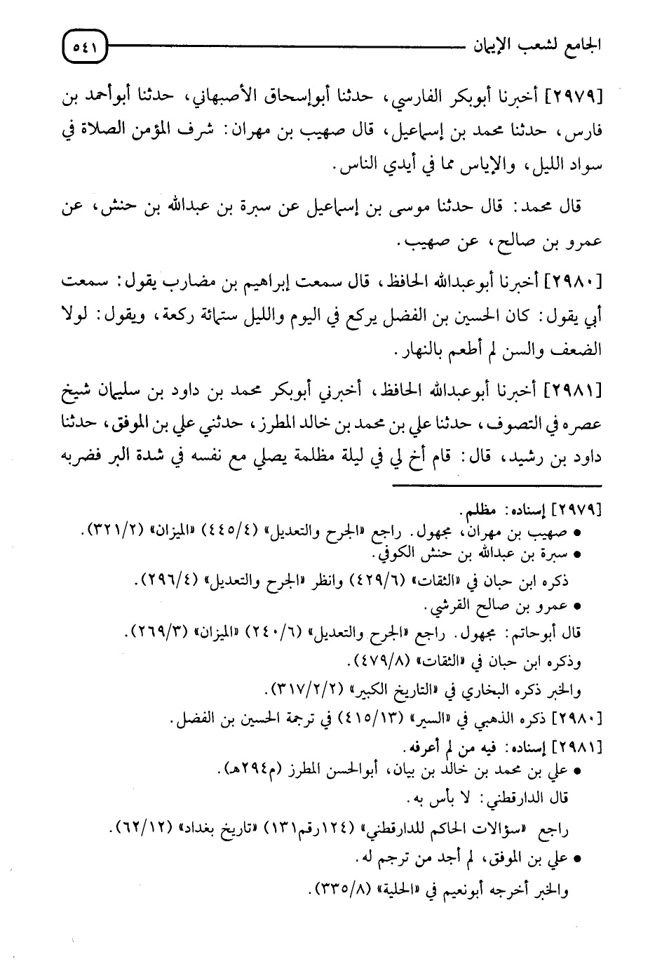 2979 - أَخْبَرَنَا أَبُو بَكْرٍ الْفَارِسِيُّ، حَدَّثَنَا أَبُو إِسْحَاقَ الْأَصْبَهَانِيُّ، حَدَّثَنَا أَبُو أَحْمَدَ بْنُ فَارِسٍ، حَدَّثَنَا مُحَمَّدُ بْنُ إِسْمَاعِيلَ، قَالَ صُهَيْبُ بْنُ مِهْرَانَ: " §شَرَفُ الْمُؤْمِنِ الصَّلَاةُ فِي سَوَادِ اللَّيْلِ، وَالْإيَاْسُ مِمَّا فِي أَيْدِي النَّاسِ " قَالَ مُحَمَّدٌ: قَالَ: حَدَّثَنَا مُوسَى بْنُ إِسْمَاعِيلَ، عَنْ سَبْرَةَ بْنِ عَبْدِ اللهِ بْنِ حَنَشٍ، عَنْ عَمْرِو بْنِ صَالِحٍ، عَنْ صُهَيْبٍ