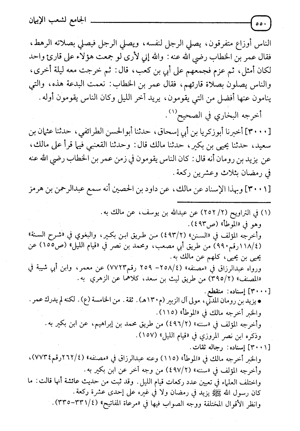 3000 - أَخْبَرَنَا أَبُو زَكَرِيَّا بْنُ أَبِي إِسْحَاقَ، حَدَّثَنَا أَبُو الْحَسَنِ الطَّرَائِفِيُّ، حَدَّثَنَا عُثْمَانُ بْنُ سَعِيدٍ، حَدَّثَنَا يَحْيَى بْنُ بُكَيْرٍ، حَدَّثَنَا مَالِكٌ، قَالَ: وحَدَّثَنَا الْقَعْنَبِيُّ، فِيمَا قَرَأَ عَلَى مَالِكٍ، عَنْ يَزِيدَ بْنِ رُومَانَ، أَنَّهُ قَالَ: " كَانَ النَّاسُ §يَقُومُونَ فِي زَمَنِ عُمَرَ بْنِ الْخَطَّابِ رَضِيَ اللهُ عَنْهُ فِي رَمَضَانَ بِثَلَاثٍ وَعِشْرِينَ رَكْعَةً "