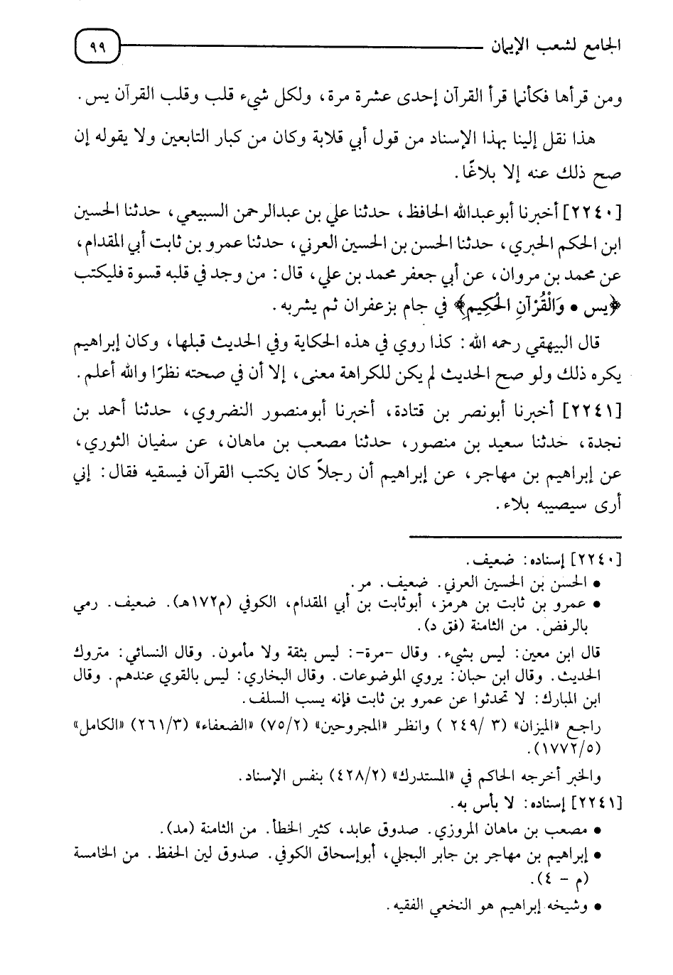 2240 - أَخْبَرَنَا أَبُو عَبْدِ اللهِ الْحَافِظُ، حدثنا عَلِيُّ بْنُ عَبْدِ الرَّحْمَنِ السَّبِيعِيُّ، حدثنا الْحُسَيْنُ بْنُ الْحَكَمِ الْحِبرِيُّ، حدثنا الْحَسَنُ بْنُ الْحُسَيْنِ الْعُرَنِيُّ، حدثنا عَمْرُو بْنُ ثَابِتِ بْنِ أَبِي الْمِقْدَامِ، عَنْ مُحَمَّدِ بْنِ مَرْوَانَ، عَنْ أَبِي جَعْفَرٍ مُحَمَّدِ بْنِ عَلِيٍّ، قَالَ: " §مَنْ وَجَدَ فِي قَلْبِهِ قَسْوَةً فَلْيَكْتُبْ {يس وَالْقُرْآنِ الْحَكِيمِ} [يس: 2] فِي جَامٍ بِزَعْفَرَانَ، ثُمَّ يَشْرَبُهُ " قَالَ الْبَيْهَقِيُّ رَحِمَهُ اللهُ: " كَذَا رُوِيَ فِي هَذِهِ الْحِكَايَةِ وَفِي الْحَدِيثِ قَبْلَهَا وَكَانَ إِبْرَاهِيمُ يَكْرَهُ ذَلِكَ وَلَوْ صَحَّ الْحَدِيثُ لَمْ يَكُنِ لِلْكَرَاهَةِ مَعْنًى إِلَّا أَنَّ فِي صِحَّتِهِ نَظَرًا، وَاللهُ أَعْلَمُ "