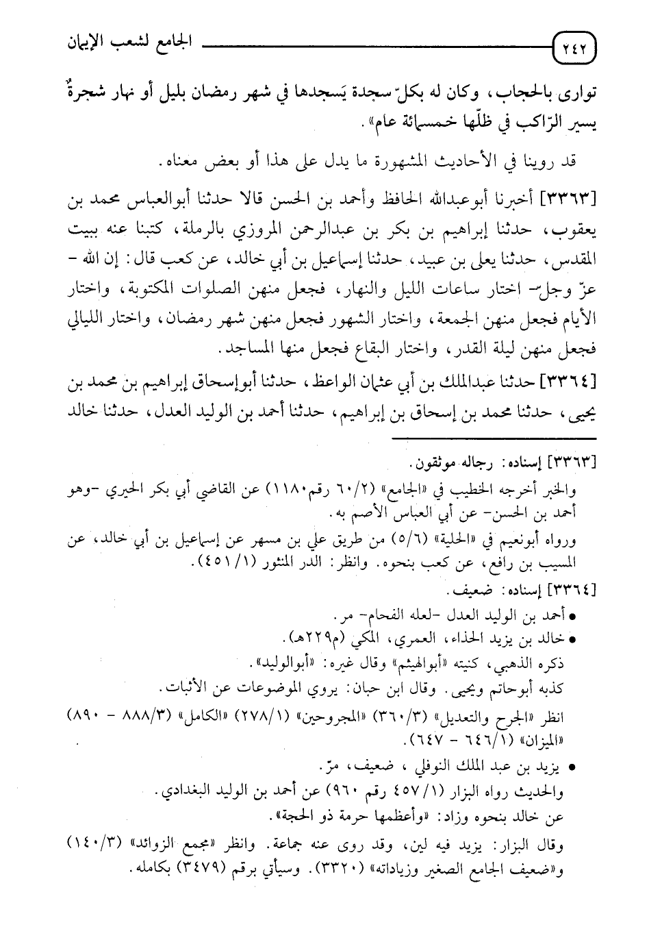 3363 - أَخْبَرَنَا أَبُو عَبْدِ اللهِ الْحَافِظُ، وَأَحْمَدُ بْنُ الْحَسَنِ، قَالَا: حَدَّثَنَا أَبُو الْعَبَّاسِ مُحَمَّدُ بْنُ يَعْقُوبَ، حَدَّثَنَا إِبْرَاهِيمُ بْنُ بَكْرِ بْنِ عَبْدِ الرَّحْمَنِ الْمَرْوَزِيُّ، بالرَّمْلَةِ كَتَبْنَا عَنْهُ بِبَيْتِ الْمَقْدِسِ، حَدَّثَنَا يَعْلَى بْنُ عُبَيْدٍ، حَدَّثَنَا إِسْمَاعِيلُ بْنُ أَبِي خَالِدٍ، عَنْ كَعْبٍ قَالَ: " إِنَّ §اللهَ عَزَّ وَجَلَّ اخْتَارَ سَاعَاتِ اللَّيْلِ وَالنَّهَارِ، فَجَعَلَ مِنْهُنَّ الصَّلَوَاتِ الْمَكْتُوبَةِ، وَاخْتَارَ الْأَيَّامَ فَجَعَلَ مِنْهُنَّ الْجُمُعَةَ، وَاخْتَارَ الشُّهُورَ فَجَعَلَ مِنْهُنَّ شَهْرَ رَمَضَانَ، وَاخْتَارَ اللَّيَالِي فَجَعَلَ مِنْهُنَّ لَيْلَةَ الْقَدْرِ، وَاخْتَارَ الْبِقَاعَ فَجَعَلَ مِنْهَا الْمَسَاجِدَ "