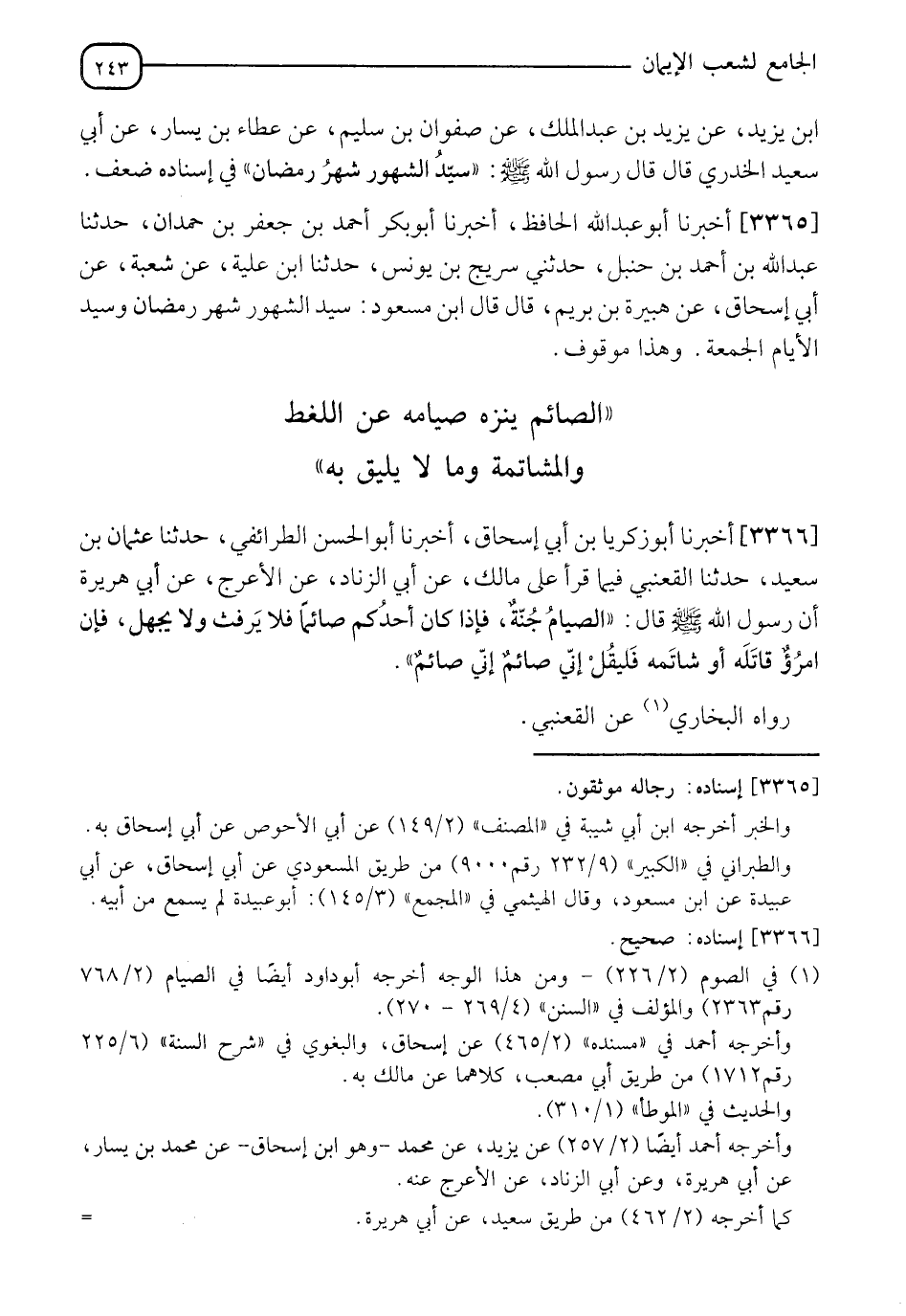 3366 - أَخْبَرَنَا أَبُو زَكَرِيَّا بْنُ أَبِي إِسْحَاقَ، أخبرنا أَبُو الْحَسَنِ الطَّرَائِفِيُّ، حَدَّثَنَا عُثْمَانُ بْنُ سَعِيدٍ، حَدَّثَنَا الْقَعْنَبِيُّ، فِيمَا قَرَأَ عَلَى مَالِكٍ، عَنْ أَبِي الزِّنَادِ، عَنِ الْأَعْرَجِ، عَنْ أَبِي هُرَيْرَةَ، أَنَّ رَسُولَ اللهِ صَلَّى اللَّهُ عَلَيْهِ وَسَلَّمَ قَالَ: §" الصِّيَامُ جُنَّةٌ فَإِذَا كَانَ أَحَدُكُمْ صَائِمًا فَلَا يَرْفُثْ، وَلَا يَجْهَلْ فَإِنِ امْرِؤٌ قَاتَلَهُ أَوْ شَاتَمَهُ فَلْيَقُلْ: إِنِّي صَائِمٌ إِنِّي صَائِمٌ " رَوَاهُ الْبُخَارِيُّ، عَنِ الْقَعْنَبِيِّ