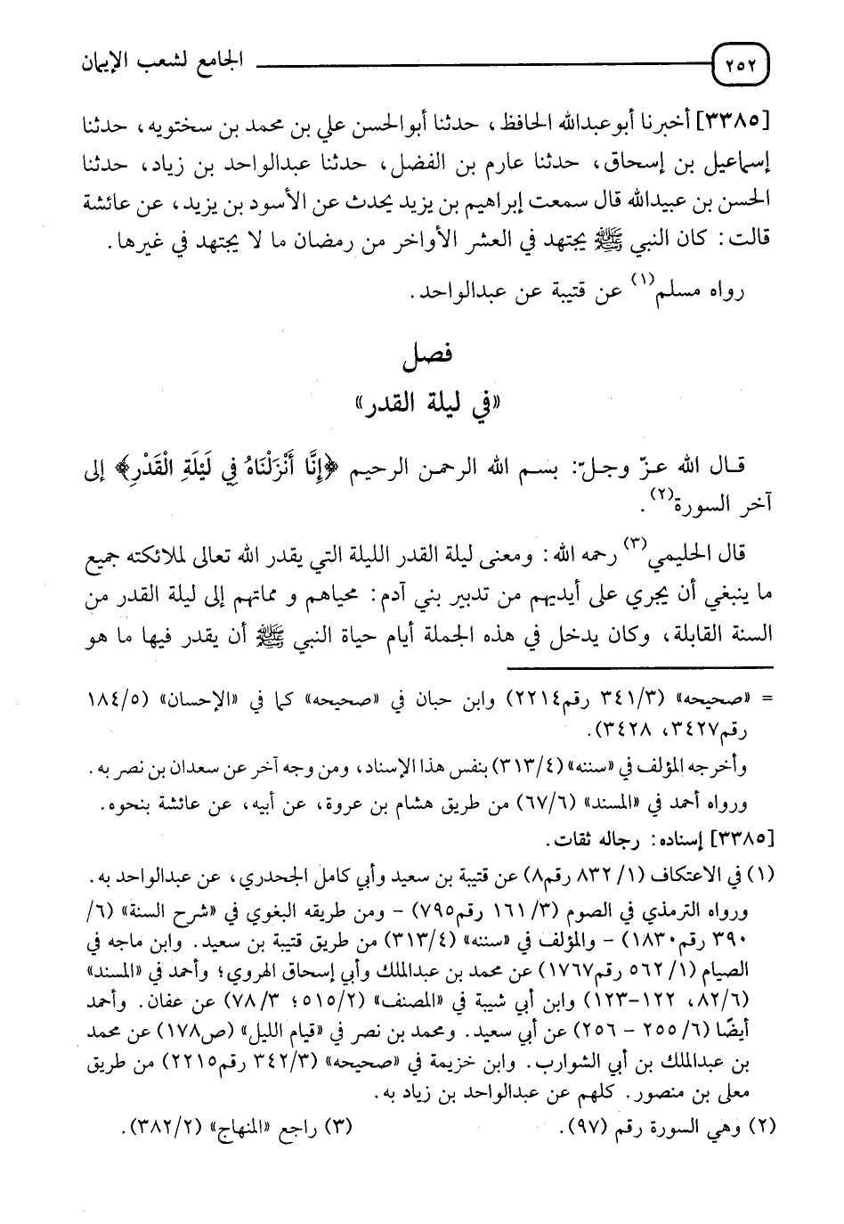 §فَصْلٌ فِي لَيْلَةِ الْقَدْرِ قَالَ اللهُ عَزَّ وَجَلَّ بِسْمِ اللهِ الرَّحْمَنِ الرَّحِيمِ: {إِنَّا أَنْزَلْنَاهُ فِي لَيْلَةِ الْقَدْرِ} [القدر: 1] إِلَى آخِرِ السُّورَةِ، قَالَ الْحَلِيمِيُّ رَحِمَهُ اللهُ: " وَمَعْنَى لَيْلَةِ الْقَدْرِ: اللَّيْلَةُ الَّتِي يُقَدِّرُ اللهُ تَعَالَى لِمَلَائِكَتِهِ جَمِيعَ مَا يَنْبَغِي أَنْ يَجْرِيَ عَلَى أَيْدِيهِمْ مِنْ تَدْبِيرِ بَنِي آدَمَ مَحْيَاهُمْ، وَمَمَاتُهُمْ إِلَى لَيْلَةِ الْقَدْرِ مِنَ السَّنَةِ الْقَابِلَةِ، وَكَانَ يَدْخُلُ فِي هَذِهِ الْجُمْلَةِ أَيَّامَ حَيَاةِ النَّبِيِّ صَلَّى اللَّهُ عَلَيْهِ وَسَلَّمَ أَنْ يُقَدِّرَ فِيهَا مَا هُوَ