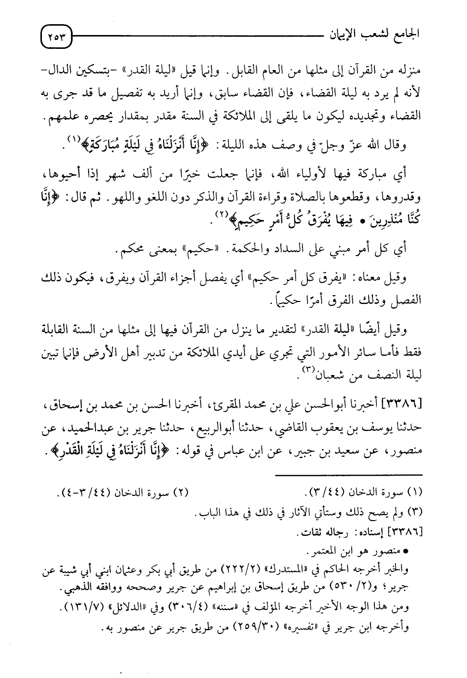 3386 - أَخْبَرَنَا أَبُو الْحَسَنِ عَلِيُّ بْنُ مُحَمَّدِ الْمُقْرِئُ، أخبرنا الْحَسَنُ بْنُ مُحَمَّدِ بْنِ إِسْحَاقَ، حَدَّثَنَا يُوسُفُ بْنُ يَعْقُوبَ الْقَاضِي، حَدَّثَنَا أَبُو الرَّبِيعِ، حَدَّثَنَا جَرِيرُ بْنُ عَبْدِ الْحَمِيدِ، عَنْ مَنْصُورٍ، عَنْ سَعِيدِ بْنِ جُبَيْرٍ، عَنِ ابْنِ عَبَّاسٍ، فِي قَوْلِهِ: إِنَّا أَنْزَلْنَاهُ فِي لَيْلَةِ الْقَدْرِ -[254]- قَالَ: §" أَنْزَلَ اللهُ عَزَّ وَجَلَّ الْقُرْآنَ جُمْلَةً وَاحِدَةً إِلَى سَمَاءِ الدُّنْيَا فِي لَيْلَةِ الْقَدْرِ، فَكَانَ بِمَوْقِعِ النُّجُومِ، وَكَانَ اللهُ يُنَزِّلُهُ عَلَى رَسُولِهِ صَلَّى اللَّهُ عَلَيْهِ وَسَلَّمَ بَعْضُهُ فِي أَثَرِ بَعْضٍ "، ثُمَّ قَرَأَ: وَقَالَ الَّذِينَ كَفَرُوا لَوْلَا نُزِّلَ عَلَيْهِ الْقُرْآنُ جُمْلَةً وَاحِدَةً، كَذَلِكَ لِنُثَبِّتَ بِهِ فُؤَادَكَ وَرَتَّلْناهُ تَرْتِيلًا