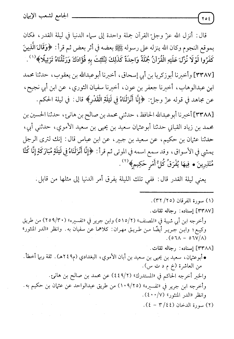 3388 - أَخْبَرَنَا أَبُو عَبْدِ اللهِ الْحَافِظُ، حَدَّثَنِي مُحَمَّدُ بْنُ صَالِحِ بْنِ هَانِئٍ، حَدَّثَنَا الْحُسَيْنُ بْنُ مُحَمَّدِ بْنِ زِيَادٍ الْقَبَّانِيُّ، حَدَّثَنِي أَبُو عُثْمَانَ سَعِيدُ بْنُ يَحْيَى بْنِ سَعِيدٍ الْأُمَوِيُّ، حَدَّثَنِي أَبِي، حَدَّثَنَا عُثْمَانُ بْنُ حَكِيمٍ، عَنْ سَعِيدِ بْنِ جُبَيْرٍ، عَنِ ابْنِ عَبَّاسٍ، قَالَ: " إِنَّكَ لَتَرَى الرَّجُلَ يَمْشِي فِي الْأَسْوَاقِ وَقَدْ سُمِعَ اسْمُهُ فِي الْمَوْتَى "، ثُمَّ قَرَأَ: {§إِنَّا أَنْزَلْنَاهُ فِي لَيْلَةٍ مُبَارَكَةٍ إِنَّا كُنَّا مُنْذِرِينَ فِيهَا يُفَرَقُ كُلُّ أَمْرٍ حَكِيمٍ} [الدخان: 4] " يَعْنِي لَيْلَةَ الْقَدْرِ "، قَالَ: " فَفِي تِلْكَ اللَّيْلَةِ يُفَرَقُ أَمْرُ الدُّنْيَا إِلَى مِثْلِهَا مِنْ قَابِلٍ "
