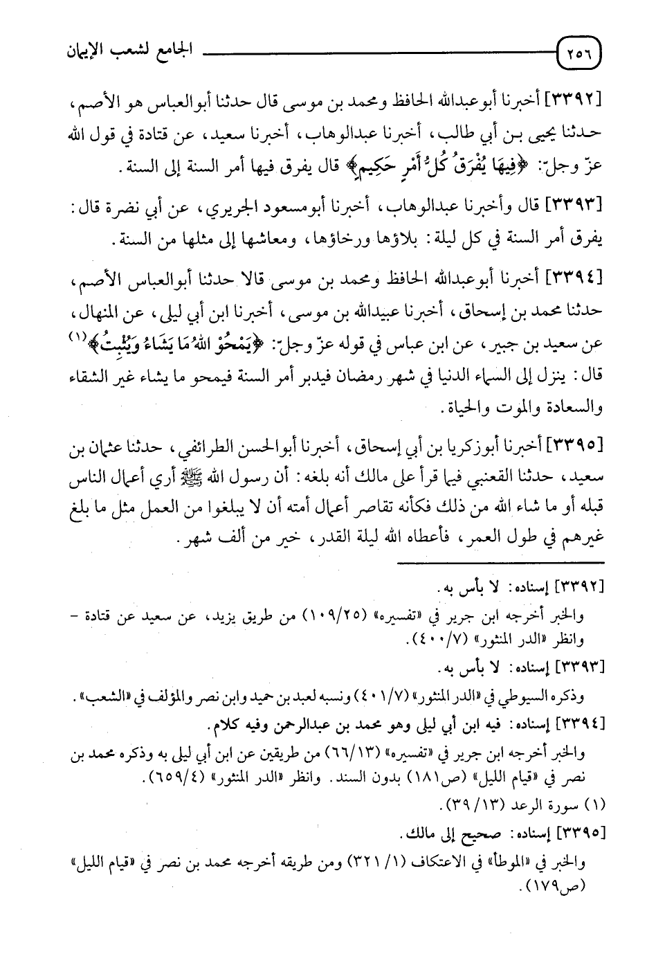 3394 - أَخْبَرَنَا أَبُو عَبْدِ اللهِ الْحَافِظُ، وَمُحَمَّدُ بْنُ مُوسَى، قَالَا: حَدَّثَنَا أَبُو الْعَبَّاسِ الْأَصَمُّ، حَدَّثَنَا مُحَمَّدُ بْنُ إِسْحَاقَ، أَخْبَرَنَا عُبَيْدُ اللهِ بْنُ مُوسَى، أَخْبَرَنَا ابْنُ أَبِي لَيْلَى، عَنِ الْمِنْهَالِ، عَنْ سَعِيدِ بْنِ جُبَيْرٍ، عَنِ ابْنِ عَبَّاسٍ، فِي قَوْلِهِ عَزَّ وَجَلَّ: يَمْحُو اللهُ مَا يَشَاءُ وَيُثْبِتْ قَالَ: §" يَنْزِلُ إِلَى السَّمَاءِ الدُّنْيَا فِي شَهْرِ رَمَضَانَ فَيُدَبِّرُ أَمْرَ السَّنَةِ، فَيَمْحُوَ مَا يَشَاءُ غَيْرَ الشَّقَاءِ وَالسَّعَادَةِ، وَالْمَوْتِ وَالْحَيَاةِ "