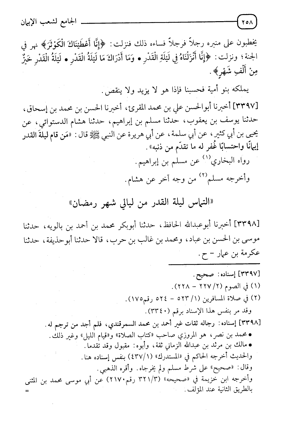3397 - أَخْبَرَنَا أَبُو الْحَسَنِ عَلِيُّ بْنُ مُحَمَّدٍ الْمُقْرِئُ، أخبرنا الْحَسَنُ بْنُ مُحَمَّدِ بْنِ إِسْحَاقَ، حَدَّثَنَا يُوسُفُ بْنُ يَعْقُوبَ، حَدَّثَنَا مُسْلِمُ بْنُ إِبْرَاهِيمَ، حَدَّثَنَا هِشَامٌ الدَّسْتُوَائِيُّ، عَنْ يَحْيَى بْنِ أَبِي كَثِيرٍ، عَنْ أَبِي سَلَمَةَ، عَنْ أَبِي هُرَيْرَةَ، عَنِ النَّبِيِّ صَلَّى اللَّهُ عَلَيْهِ وَسَلَّمَ قَالَ: §" مَنْ قَامَ لَيْلَةَ الْقَدْرِ إِيمَانًا وَاحْتِسَابًا غُفِرَ لَهُ مَا تَقَدَّمَ مِنْ ذَنْبِهِ " رَوَاهُ الْبُخَارِيُّ، عَنْ مُسْلِمِ بْنِ إِبْرَاهِيمَ، وَأَخْرَجَهُ مُسْلِمٌ مِنْ وَجْهٍ آخَرَ، عَنْ هِشَامٍ