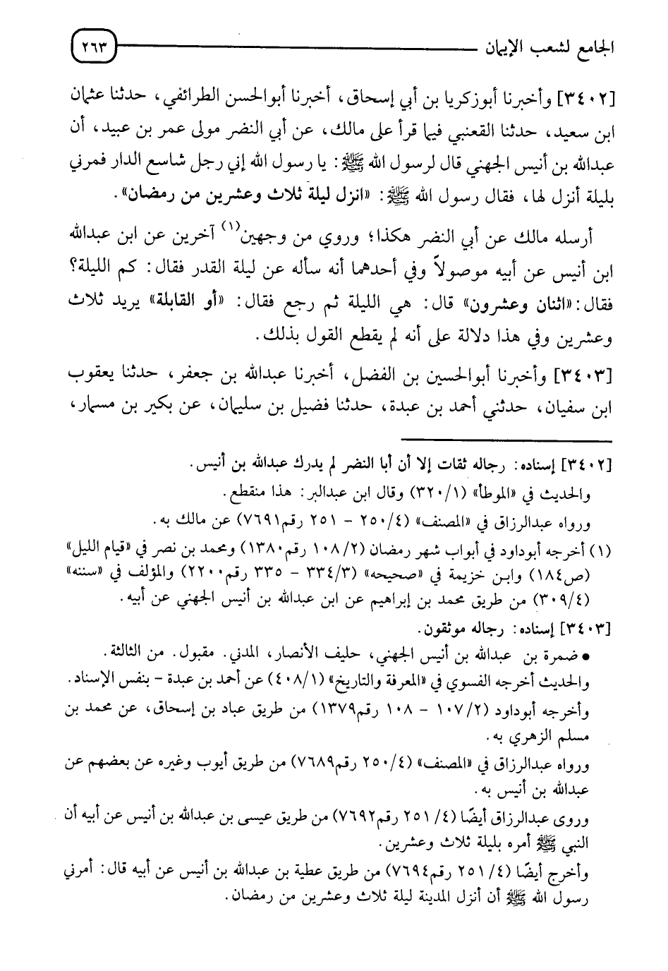 3402 - وَأَخْبَرَنَا أَبُو زَكَرِيَّا بْنُ أَبِي إِسْحَاقَ، أخبرنا أَبُو الْحَسَنِ الطَّرَائِفِيُّ، حَدَّثَنَا عُثْمَانُ بْنُ سَعِيدٍ، حَدَّثَنَا الْقَعْنَبِيُّ، فِيمَا قَرَأَ عَلَى مَالِكٍ، عَنْ أَبِي النَّضْرِ، مَوْلَى عُمَرَ بْنِ عُبَيْدٍ، أَنَّ عَبْدَ اللهِ بْنَ أُنَيْسٍ الْجُهَنِيَّ، قَالَ لِرَسُولِ اللهِ صَلَّى اللَّهُ عَلَيْهِ وَسَلَّمَ: يَا رَسُولَ اللهِ، إِنِّي رَجُلٌ شَاسِعُ الدَّارِ، فَمُرْنِي بِلَيْلَةٍ أَنْزِلُ لَهَا، فَقَالَ رَسُولُ اللهِ صَلَّى اللَّهُ عَلَيْهِ وَسَلَّمَ: §" انْزِلْ لَيْلَةَ ثَلَاثٍ وَعِشْرِينَ مِنْ رَمَضَانَ " أَرْسَلَهُ مَالِكٌ عَنْ أَبِي النَّضْرِ هَكَذَا، وَرُوِيَ مِنْ وَجْهَيْنِ آخَرَيْنِ عَنْ ابْنِ عَبْدِ اللهِ بْنِ أُنَيْسٍ، عَنْ أَبِيهِ مَوْصُولًا وَفِي أَحَدِهِمَا أَنَّهُ سَأَلَهُ عَنْ لَيْلَةِ الْقَدْرِ، فَقَالَ: كَمِ اللَّيْلَةُ؟ فَقَالَ: اثْنَانِ وَعِشْرُونَ، قَالَ: هِيَ اللَّيْلَةُ، ثُمَّ رَجَعَ فَقَالَ: أَوِ الْقَابِلَةُ - يُرِيدُ ثَلَاثًا وَعِشْرِينَ - وَفِي هَذَا دَلَالَةٌ عَلَى أَنَّهُ لَمْ يَقْطَعِ الْقَوْلَ بِذَلِكَ