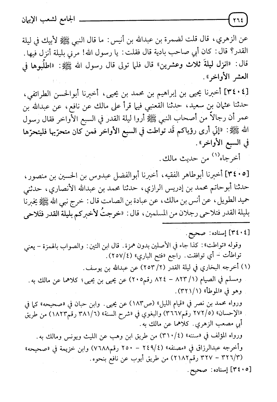 3404 - أَخْبَرَنَا يَحْيَى بْنُ إِبْرَاهِيمَ بْنِ مُحَمَّدِ بْنِ يَحْيَى، أَخْبَرَنَا أَبُو الْحَسَنِ الطَّرَائِفِيُّ، حَدَّثَنَا عُثْمَانُ بْنُ سَعِيدٍ، حَدَّثَنَا الْقَعْنَبِيُّ، فِيمَا قَرَأَ عَلَى مَالِكٍ، عَنْ نَافِعٍ، عَنْ عَبْدِ اللهِ بْنِ عُمَرَ، أَنَّ رِجَالًا مِنْ أَصْحَابِ النَّبيِّ صَلَّى اللَّهُ عَلَيْهِ وَسَلَّمَ أُرُوا لَيْلَةَ الْقَدْرِ فِي السَّبْعِ الْأَوَاخِرِ، فَقَالَ رَسُولُ اللهِ صَلَّى اللَّهُ عَلَيْهِ وَسَلَّمَ: " §إِنِّي أَرَى رُؤْيَاكُمْ فَقَدْ تَوَاطَأَتْ فِي السَّبْعِ الْأَوَاخِرِ، فَمَنْ كَانَ مُتَحَرِّيَهَا فَلْيَتَحَرَّهَا فِي السَّبْعِ الْأَوَاخِرِ " أَخْرَجَاهُ مِنْ حَدِيثِ مَالِكٍ