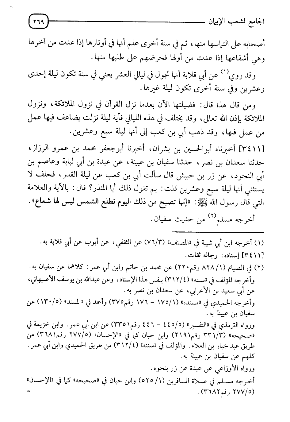 3411 - أَخْبَرَنَاهُ أَبُو الْحُسَيْنِ بْنُ بِشْرَانَ، أَخْبَرَنَا أَبُو جَعْفَرٍ مُحَمَّدُ بْنُ عَمْرٍو الرَّزَّازُ، حَدَّثَنَا سَعْدَانُ بْنُ نَصْرٍ، حَدَّثَنَا سُفْيَانُ بْنُ عُيَيْنَةَ، عَنْ عَبْدَةَ بْنِ أَبِي لُبَابَةَ، وَعَاصِمِ بْنِ أَبِي النَّجُودِ، عَنْ زِرِّ بْنِ حُبَيْشٍ، قَالَ: سَأَلْتُ أُبَيَّ بْنَ كَعْبٍ عَنْ لَيْلَةِ الْقَدْرِ، فَحَلَفَ: لَا يَسْتَثْنِي أَنَّهَا لَيْلَةُ سَبْعٍ وَعِشْرِينَ، قُلْتُ: بِمَ تَقُولُ ذَلِكَ أَبَا الْمُنْذِرِ، قَالَ: بِالْآيَةِ وَالْعَلَامَةِ الَّتِي قَالَ رَسُولُ اللهِ صَلَّى اللَّهُ عَلَيْهِ وَسَلَّمَ: " أَنَّهَا §تُصْبِحُ مِنْ ذَلِكَ الْيَوْمِ تَطْلُعُ الشَّمْسُ لَيْسَ لَهَا شُعَاعٌ " أَخْرَجَهُ مُسْلِمٌ مِنْ حَدِيثِ سُفْيَانَ، -[270]- وَهَذَا أَيْضًا مِنْ طَرِيقِ الِاسْتِدْلَالِ، وَهَذِهِ الْعَلَامَةُ قَدْ وُجِدَتْ فِي غَيْرِهَا أَيْضًا، وَكَانَ صَلَّى اللَّهُ عَلَيْهِ وَسَلَّمَ أَخْبَرَ بِهَا عَنِ اللَّيْلَةِ الَّتِي رَآهَا فِيهَا