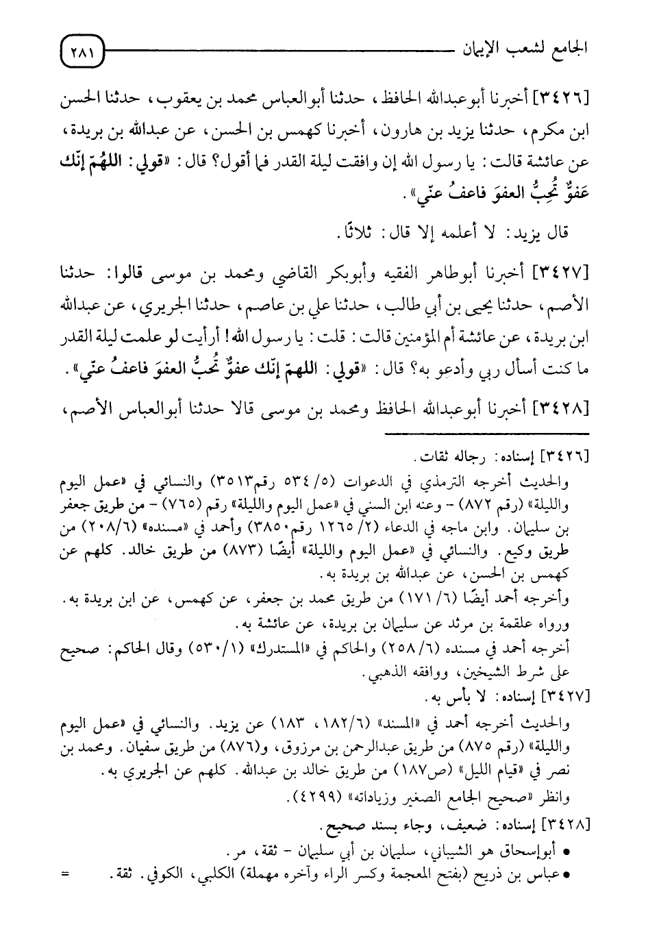 3427 - أَخْبَرَنَا أَبُو طَاهِرٍ الْفَقِيهُ، وَأَبُو بَكْرٍ الْقَاضِي، وَمُحَمَّدُ بْنُ مُوسَى، قَالُوا: حَدَّثَنَا الْأَصَمُّ، حَدَّثَنَا يَحْيَى بْنُ أَبِي طَالِبٍ، حَدَّثَنَا عَلِيُّ بْنُ عَاصِمٍ، حَدَّثَنَا الْجُرَيْرِيُّ، عَنْ عَبْدِ اللهِ بْنِ بُرَيْدَةَ، عَنْ عَائِشَةَ أُمِّ الْمُؤْمِنِينَ، قَالَتْ: قُلْتُ: يَا رَسُولَ اللهِ، أَرَأَيْتَ لَوْ عَلِمْتُ لَيْلَةَ الْقَدْرِ مَا كُنْتُ أَسْأَلُ رَبِّي وَأَدْعُو بِهِ؟ قَالَ: " قَوْلِي: §اللهُمَّ إِنَّكَ عَفُوٌّ تُحِبُّ الْعَفْوَ فَاعْفُ عَنِّي "