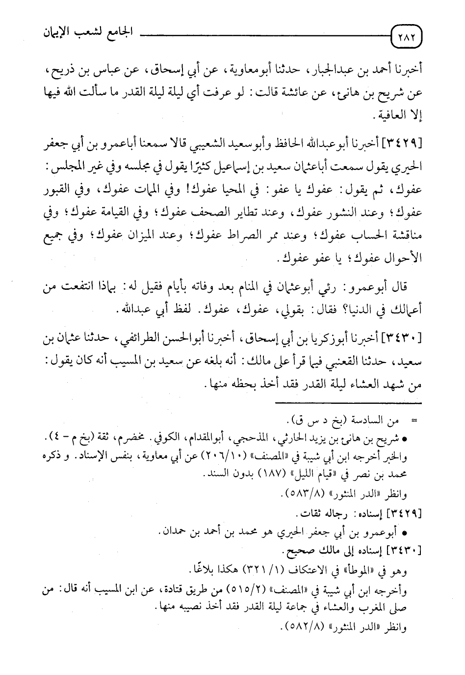 3430 - أَخْبَرَنَا أَبُو زَكَرِيَّا بْنُ أَبِي إِسْحَاقَ، أَخْبَرَنَا أَبُو الْحَسَنِ الطَّرَائِفِيُّ، حَدَّثَنَا عُثْمَانُ بْنُ سَعِيدٍ، حَدَّثَنَا الْقَعْنَبِيُّ، فِيمَا قَرَأَ عَلَى مَالِكٍ، أَنَّهُ بَلَغَهُ عَنْ سَعِيدِ بْنِ الْمُسَيِّبِ أَنَّهُ كَانَ يَقُولُ: §" مَنْ شَهِدَ الْعِشَاءَ لَيْلَةَ الْقَدْرِ فَقَدْ أَخَذَ بِحَظِّهِ مِنْهَا "