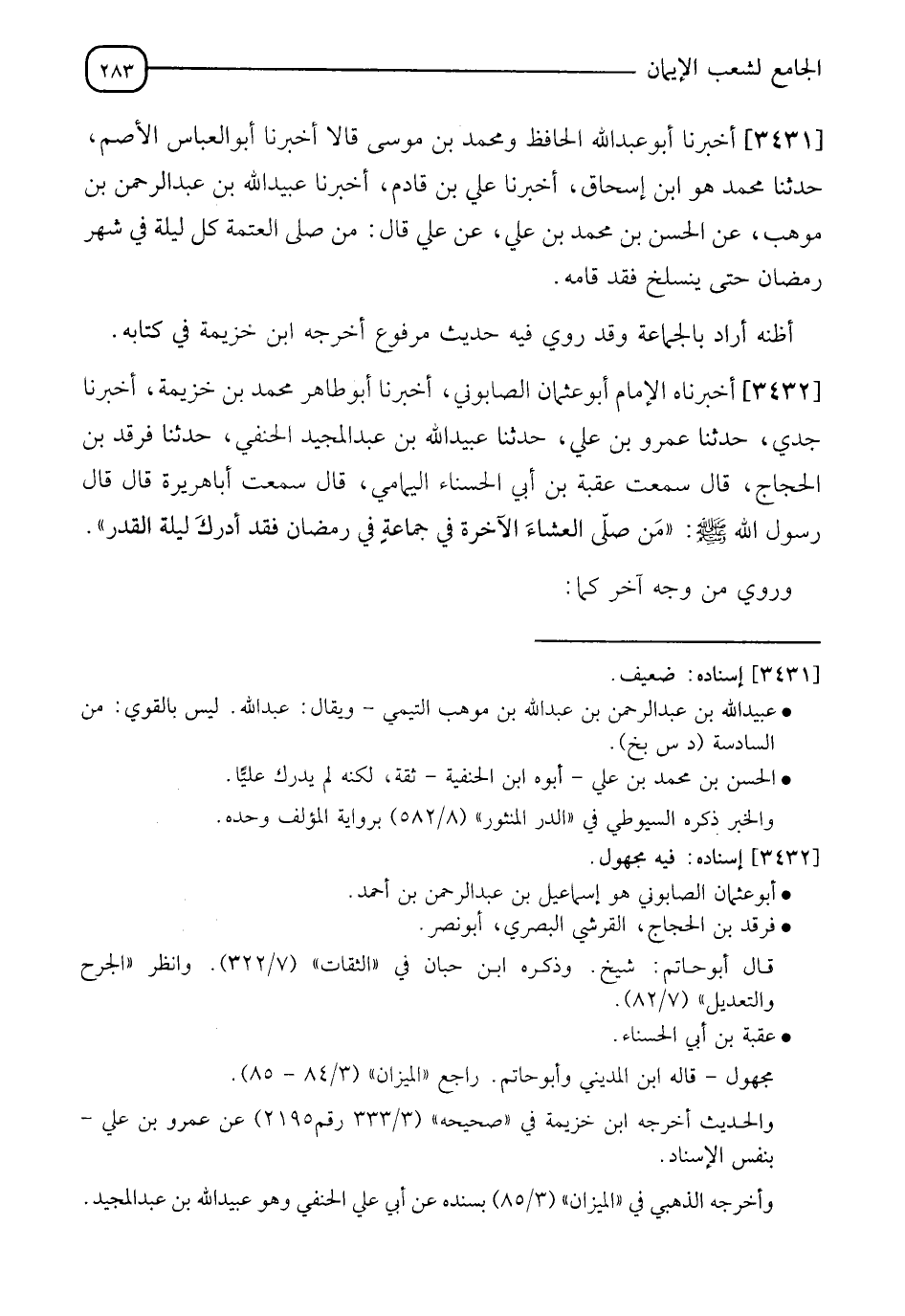 3432 - أَخْبَرَنَاه الْإِمَامُ أَبُو عُثْمَانَ الصَّابُونِيُّ، أَخْبَرَنَا أَبُو طَاهِرِ مُحَمَّدُ بْنُ خُزَيْمَةَ، أَخْبَرَنَا جَدِّي، حَدَّثَنَا عَمْرُو بْنُ عَلِيٍّ، حَدَّثَنَا عُبَيْدُ اللهِ بْنُ عَبْدِ الْمَجِيدِ الْحَنَفِيُّ، حَدَّثَنَا فَرْقَدُ بْنُ الْحَجَّاجِ، قَالَ: سَمِعْتُ عُقْبَةَ بْنَ أَبِي الْحَسْنَاءِ الْيَمَامِيَّ، قَالَ: سَمِعْتُ أَبَا هُرَيْرَةَ، قَالَ: قَالَ رَسُولُ اللهِ صَلَّى اللَّهُ عَلَيْهِ وَسَلَّمَ: §" مَنْ صَلَّى الْعِشَاءَ الْآخِرَةَ فِي جَمَاعَةٍ فِي رَمَضَانَ فَقَدْ أَدْرَكَ لَيْلَةَ الْقَدْرِ ". " وَرُوِيَ مِنْ وَجْهٍ آخَرَ "