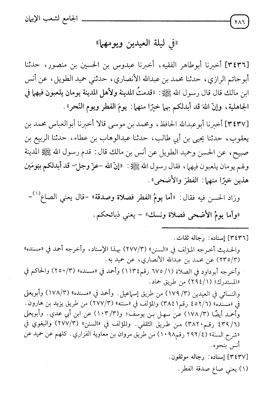 3436 - أَخْبَرَنَا أَبُو طَاهِرٍ الْفَقِيهُ، أَخْبَرَنَا عَبْدُوسُ بْنُ الْحُسَيْنِ بْنِ مَنْصُورٍ، حَدَّثَنَا أَبُو حَاتِمٍ الرَّازِيُّ، حَدَّثَنَا مُحَمَّدُ بْنُ عَبْدِ اللهِ الْأَنْصَارِيُّ، حَدَّثَنِي حُمَيْدٌ الطَّوِيلُ، عَنْ أَنَسِ بْنِ مَالِكٍ، قَالَ: قَالَ رَسُولُ اللهِ صَلَّى اللَّهُ عَلَيْهِ وَسَلَّمَ: " §قَدِمْتُ الْمَدِينَةَ وَلِأَهْلِ الْمَدِينَةِ يَوْمَانِ يَلْعَبُونَ فِيهِمَا فِي الْجَاهِلِيَّةِ، وَإِنَّ اللهَ قَدْ أَبْدَلَكُمْ بِهِمَا خَيْرًا مِنْهُمَا يَوْمَ الْفِطْرِ وَيَوْمَ النَّحْرِ "