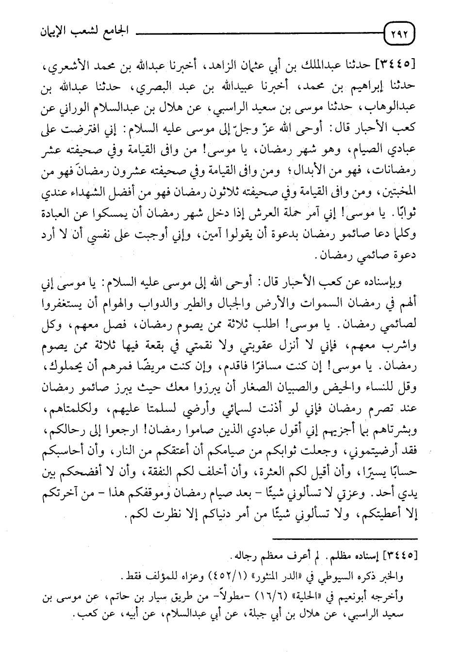 3445 - حَدَّثَنَا عَبْدُ الْمَلِكِ بْنُ أَبِي عُثْمَانَ الزَّاهِدُ، أَخْبَرَنَا عَبْدُ اللهِ بْنُ مُحَمَّدٍ الْأَشْعَرِيُّ، حَدَّثَنَا إِبْرَاهِيمُ بْنُ مُحَمَّدٍ، أَخْبَرَنَا عُبَيْدُ اللهِ بْنُ عَبْدٍ الْبَصْرِيُّ، حَدَّثَنَا عَبْدُ اللهِ بْنُ عَبْدِ الْوَهَّابِ، حَدَّثَنَا مُوسَى بْنُ سَعِيدٍ الرَّاسِبِيُّ، عَنْ هِلَالِ بْنِ عَبْدِ السَّلَامِ الْوَرَّانِيُّ، عَنْ كَعْبِ الْأَحْبَارِ، قَالَ: " §أَوْحَى الله عَزَّ وَجَلَّ إِلَى مُوسَى عَلَيْهِ السَّلَامُ: إِنِّي افْتَرَضْتُ عَلَى عِبَادِي الصِّيَامَ، وَهُوَ شَهْرُ رَمَضَانَ، يَا مُوسَى مَنْ وَافَى الْقِيَامَةَ وَفِي صَحِيفَتِهِ عَشْرُ رَمَضَانَاتَ فَهُوَ مِنَ الْأَبْدَالِ، وَمَنْ وَافَى الْقِيَامَةَ وَفِي صَحِيفَتِهِ عِشْرُونَ رَمَضَانًا فَهُوَ مِنَ الْمُخْبِتِينَ، وَمَنْ وَافَى الْقِيَامَةَ وَفِي صَحِيفَتِهِ ثَلَاثُونَ رَمَضَانًا فَهُوَ مِنْ أَفْضَلِ الشُّهَدَاءِ عِنْدِي ثَوَابًا، يَا مُوسَى إِنِّي آمُرُ حَمَلَةَ الْعَرْشِ إِذَا دَخَلَ شَهْرُ رَمَضَانَ أَنْ يُمْسِكُوا عَنِ الْعِبَادَةِ وَكُلَّمَا دَعَا صَائِمُو رَمَضَانَ بِدَعْوَةٍ أَنْ يَقُولُوا آمِينَ، وَإِنِّي أَوْجَبْتُ عَلَى نَفْسِي أَنْ لَا أَرُدَّ دَعْوَةَ صَائِمِي رَمَضَانَ "