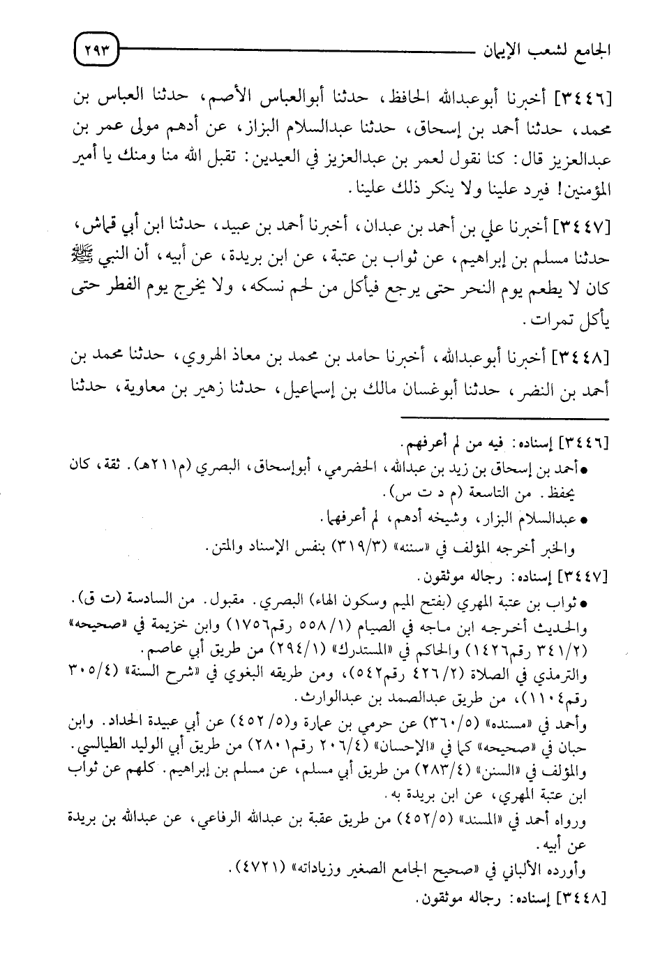 3447 - - أَخْبَرَنَا عَلِيُّ بْنُ أَحْمَدَ بْنِ عَبْدَانَ، أَخْبَرَنَا أَحْمَدُ بْنُ عُبَيْدٍ، حَدَّثَنَا ابْنُ أَبِي قَمَّاشٍ، حَدَّثَنَا مُسْلِمُ بْنُ إِبْرَاهِيمَ، عَنْ ثَوَابِ بْنِ عُتْبَةَ، عَنِ ابْنِ بُرَيْدَةَ، عَنْ أَبِيهِ: " أَنَّ النَّبيَّ صَلَّى اللَّهُ عَلَيْهِ وَسَلَّمَ كَانَ §لَا يَطْعَمُ يَوْمَ النَّحْرِ حَتَّى يَرْجِعَ فَيَأْكُلُ مِنْ لَحْمِ نُسُكِهِ، وَلَا يَخْرُجُ يَوْمَ الْفِطْرِ حَتَّى يَأْكُلَ تَمَرَاتٍ "