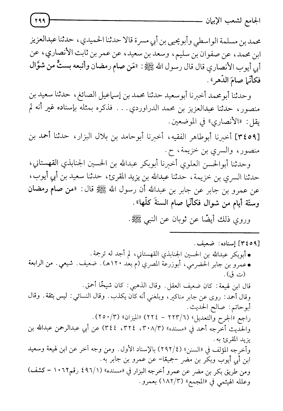 3459 - أَخْبَرَنَا أَبُو طَاهِرٍ الْفَقِيهُ، أَخْبَرَنَا أَبُو حَامِدِ بْنُ بِلَالٍ الْبَزَّارُ، حَدَّثَنَا أَحْمَدُ بْنُ مَنْصُورٍ، وَالسَّرِيُّ بْنُ خُزَيْمَةَ ح، وَحَدَّثَنَا أَبُو الْحَسَنِ الْعَلَوِيُّ، أخبرنا أَبُو بَكْرٍ عَبْدُ اللهِ بْنُ الْحُسَيْنِ الْجَنَابِذِيُّ الْقَهْسَتَانِيُّ، حدثنا السَّرِيُّ بْنُ خُزَيْمَةَ، حَدَّثَنَا عَبْدُ اللهِ بْنُ يَزِيدَ الْمُقْرِئُ، حَدَّثَنَا سَعِيدُ بْنُ أَبِي أَيُّوبَ، عَنْ عَمْرِو بْنِ جَابِرٍ، عَنْ جَابِرِ بْنِ عَبْدِ اللهِ، أَنَّ رَسُولَ اللهِ صَلَّى اللَّهُ عَلَيْهِ وَسَلَّمَ قَالَ: §" مَنْ صَامَ رَمَضَانَ وَسِتَّةَ أَيَّامٍ مِنْ شَوَّالٍ فَكَأَنَّمَا صَامَ السَّنَةَ كُلَّهَا ". وَرُوِيَ ذَلِكَ أَيْضًا عَنْ ثَوْبَانَ، عَنِ النَّبِيِّ صَلَّى اللَّهُ عَلَيْهِ وَسَلَّمَ