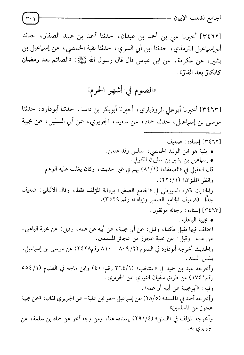 3463 - أَخْبَرَنَا أَبُو عَلِيٍّ الرُّوذْبَارِيُّ، أَخْبَرَنَا أَبُو بَكْرِ بْنُ دَاسَةَ، حَدَّثَنَا أَبُو دَاوُدَ، حَدَّثَنَا مُوسَى بْنُ إِسْمَاعِيلَ، حَدَّثَنَا حَمَّادٌ، عَنْ سَعِيدٍ الْجُرَيْرِيِّ، عَنْ أَبِي السَّلِيلِ، عَنْ مُجِيبَةَ -[302]- الْبَاهِلِيَّةِ، عَنْ أَبِيهَا، أَوْ عَمِّهَا: أَنَّهُ أَتَى رَسُولُ اللهِ صَلَّى اللَّهُ عَلَيْهِ وَسَلَّمَ ثُمَّ انْطَلَقَ، فَأَتَاهُ بَعْدَ سَنَةٍ وَقَدْ تَغَيَّرَتْ حَالُهُ وَهَيْئَتُهُ، فَقَالَ: يَا رَسُولَ اللهِ أَمَا تَعْرِفُنِي؟، قَالَ: " وَمَنْ أَنْتَ؟ "، قَالَ: أَنَا الْبَاهِلِيُّ الَّذِي جِئْتُكَ عَامَ أَوَّلِ، قَالَ: " §فَمَا غَيَّرَكَ وَقَدْ كُنْتَ حَسَنَ الْهَيْئَةِ؟ "، قَالَ: مَا أَكَلْتُ طَعَامًا مُنْذُ فَارَقْتُكَ إِلَّا بِلَيْلٍ، فَقَالَ رَسُولُ اللهِ صَلَّى اللَّهُ عَلَيْهِ وَسَلَّمَ: " عَذَّبْتَ نَفْسَكَ؟ "، ثُمَّ قَالَ: " صُمْ شَهْرَ الصَّبْرِ وَيَوْمًا مِنْ كُلِّ شَهْرٍ "، قَالَ: زِدْنِي فَإِنِّي بِي قُوَّةً، قَالَ: " صُمْ يَوْمَيْنِ "، قَالَ: زِدْنِي فَإِنَّ بِي قُوَّةً، قَالَ: " صُمْ ثَلَاثَةَ أَيَّامٍ "، قَالَ: زِدْنِي، قَالَ: " صُمْ مِنَ الْحُرُمِ وَاتْرُكْ، صُمْ مِنَ الْحُرُمِ وَاتْرُكْ، صُمْ مِنَ الْحُرُمِ وَاتْرُكْ "، وَقَالَ بِأَصَابِعِهِ الثَّلَاثَةِ فَضَمَّهَا ثُمَّ أَرْسَلَهَا