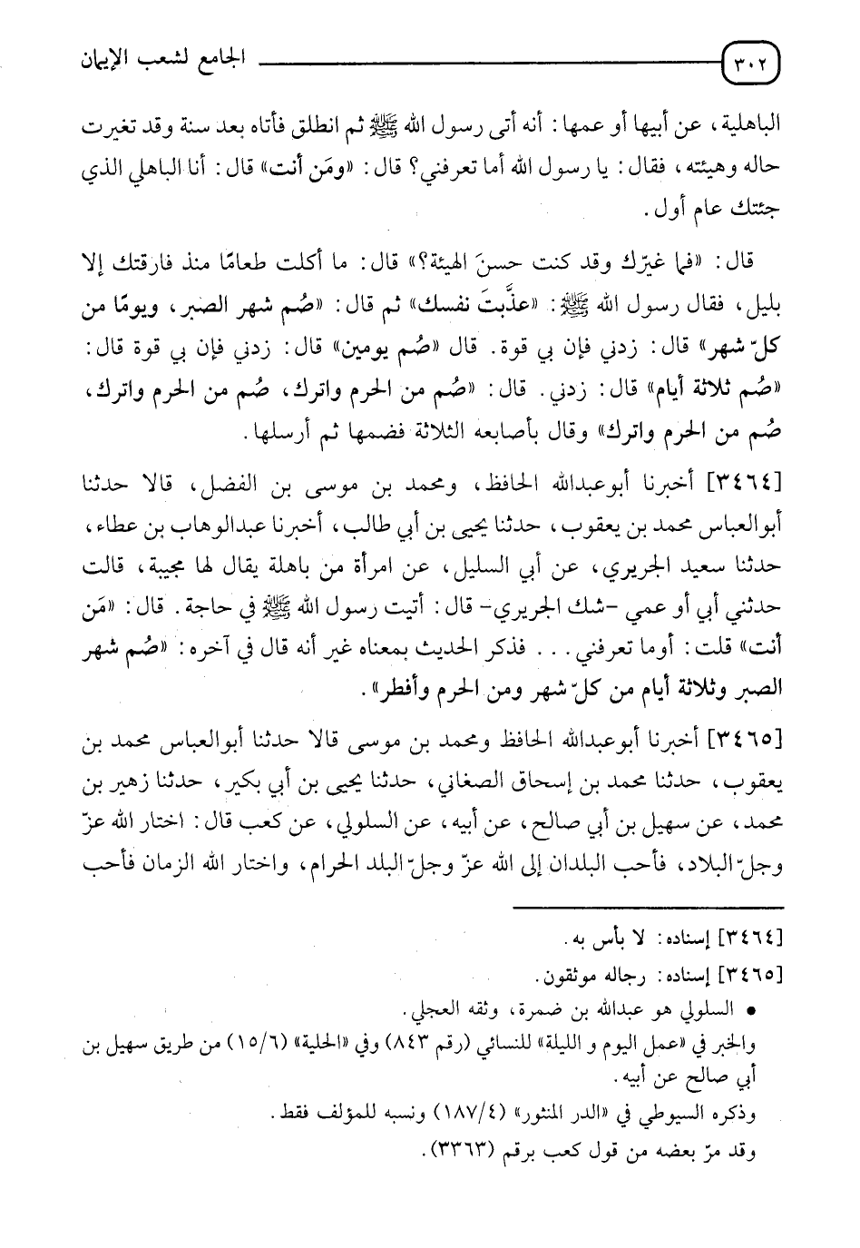3464 - أَخْبَرَنَا أَبُو عَبْدِ اللهِ الْحَافِظُ، وَمُحَمَّدُ بْنُ مُوسَى بْنِ الْفَضْلِ، قَالَا: حَدَّثَنَا أَبُو الْعَبَّاسِ مُحَمَّدُ بْنُ يَعْقُوبَ، حَدَّثَنَا يَحْيَى بْنُ أَبِي طَالِبٍ، أَخْبَرَنَا عَبْدُ الْوَهَّابِ بْنُ عَطَاءٍ، حَدَّثَنَا سَعِيدٌ الْجُرَيْرِيُّ، عَنْ أَبِي السَّلِيلِ، عَنِ امْرَأَةٍ مِنْ بَاهِلَةَ يُقَالُ لَهَا مُجِيبَةُ، قَالَتْ: حَدَّثَنِي أَبِي، أَوْ عَمِّي، شَكَّ الْجُرَيْرِيُّ، قَالَ: أَتَيْتُ رَسُولَ اللهِ صَلَّى اللَّهُ عَلَيْهِ وَسَلَّمَ فِي حَاجَةٍ، قَالَ: " مَنْ أَنْتَ؟ "، قُلْتُ: أَوَمَا تَعْرِفُنِي، فَذَكَرَ الْحَدِيثَ بِمَعْنَاهُ غَيْرَ أَنَّهُ قَالَ فِي آخِرِهِ: §" صُمْ شَهْرَ الصَّبْرِ وَثَلَاثَةَ أَيَّامٍ مِنْ كُلِّ شَهْرٍ وَمِنَ الْحُرُمِ، وَأَفْطِرْ "