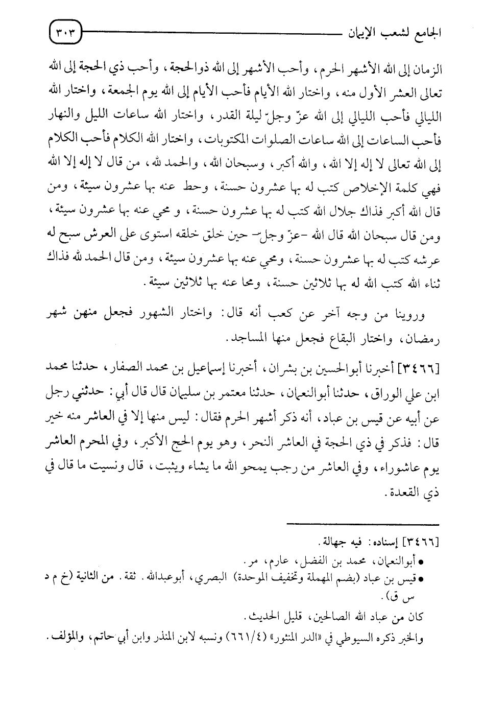 3466 - أَخْبَرَنَا أَبُو الْحُسَيْنِ بْنُ بِشْرانَ، أَخْبَرَنَا إِسْمَاعِيلُ بْنُ مُحَمَّدٍ الصَّفَّارُ، حَدَّثَنَا مُحَمَّدُ بْنُ عَلِيٍّ الْوَرَّاقُ، حَدَّثَنَا أَبُو النُّعْمَانِ، حَدَّثَنَا مُعْتَمِرُ بْنُ سُلَيْمَانَ، قَالَ: قَالَ أَبِي: حَدَّثَنِي رَجُلٌ، عَنْ أَبِيهِ، عَنْ قَيْسِ بْنِ عَبَّادٍ، أَنَّهُ ذَكَرَ أَشْهُرَ الْحُرُمِ، فَقَالَ: " §لَيْسَ مِنْهَا إِلَّا فِي الْعَاشِرِ مِنْهُ خَيْرٌ "، قَالَ: فَذَكَرَ فِي ذِي الْحِجَّةِ فِي الْعَاشِرِ النَّحْرَ وَهُوَ يَوْمُ الْحَجِّ الْأَكْبَرِ، وَفِي الْمُحَرَّمِ الْعَاشِرُ يَوْمُ عَاشُورَاءَ، وَفِي الْعَاشِرِ مِنْ رَجَبٍ يَمْحُو اللهُ مَا يَشَاءُ وَيُثْبِتُ، قَالَ: وَنَسِيتُ مَا قَالَ فِي ذِي الْقِعْدَةِ