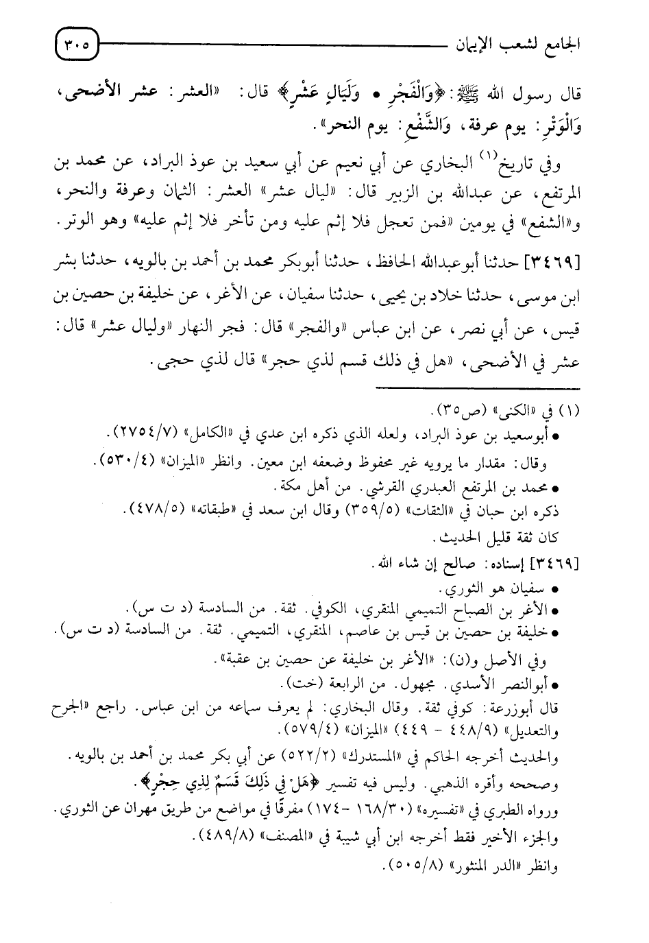 3469 - حَدَّثَنَا أَبُو عَبْدِ اللهِ الْحَافِظُ، حَدَّثَنَا أَبُو بَكْرٍ مُحَمَّدُ بْنُ أَحْمَدَ بْنِ بَالَوَيْهِ، حَدَّثَنَا بِشْرُ بْنُ مُوسَى، حَدَّثَنَا خَلَّادُ بْنُ يَحْيَى، حَدَّثَنَا سُفْيَانُ، عَنِ الْأَغَرِّ، عَنْ خَلِيفَةَ بْنِ حَصِينِ بْنِ قَيْسٍ، عَنْ أَبِي نَصْرٍ، عَنِ ابْنِ عَبَّاسٍ، {§وَالْفَجْرِ} [الفجر: 1]، قَالَ: " فَجَرُ النَّهَارِ "، {وَلَيَالٍ عَشْرٍ} [الفجر: 2]، قَالَ: " عَشْرٌ فِي الْأَضْحَى "، {هَلْ فِي ذَلِكَ قَسَمٌ لِذِي حِجْرٍ} [الفجر: 5]، قَالَ: " لِذِي حِجًى "