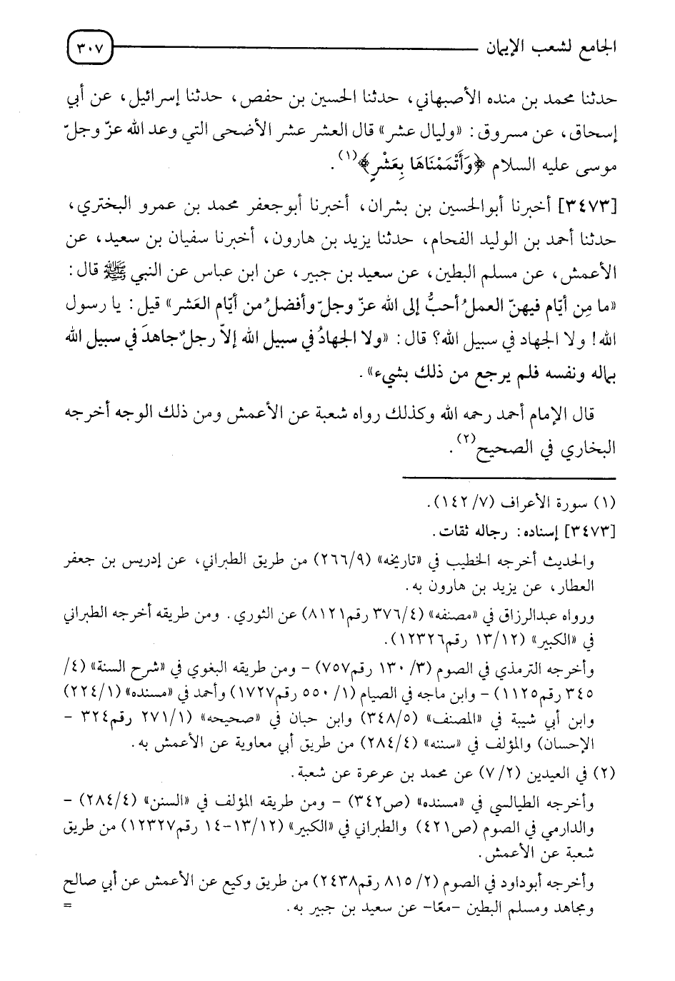 3473 - أَخْبَرَنَا أَبُو الْحُسَيْنِ بْنُ بِشْرانَ، أَخْبَرَنَا أَبُو جَعْفَرٍ مُحَمَّدُ بْنُ عَمْرِو الْبَخْتَرِيِّ، حَدَّثَنَا أَحْمَدُ بْنُ الْوَلِيدِ الْفَحَّامُ، حَدَّثَنَا يَزِيدُ بْنُ هَارُونَ، أَخْبَرَنَا سُفْيَانُ بْنُ سَعِيدٍ، عَنِ الْأَعْمَشِ، عَنْ مُسْلِمٍ الْبَطِينِ، عَنْ سَعِيدِ بْنِ جُبَيْرٍ، عَنِ ابْنِ عَبَّاسٍ، عَنِ النَّبِيِّ صَلَّى اللَّهُ عَلَيْهِ وَسَلَّمَ، قَالَ: §" مَا مِنْ أَيَّامٍ فِيهِنَّ الْعَمَلُ أَحَبُّ إِلَى اللهِ عَزَّ وَجَلَّ وَأَفْضَلُ مِنْ أَيَّامِ الْعَشْرِ "، قِيلَ: يَا رَسُولَ اللهِ وَلَا الْجِهَادُ فِي سَبِيلِ اللهِ؟، قَالَ: " وَلَا الْجِهَادُ فِي سَبِيلِ اللهِ "، إِلَّا رَجُلٌ جَاهَدَ فِي سَبِيلِ اللهِ بِمَالِهِ وَنَفْسِهِ فَلَمْ يَرْجِعْ مِنْ ذَلِكَ بِشَيْءٍ ". قَالَ الْإِمَامُ أَحْمَدُ رَحِمَهُ اللهُ: " وَكَذَلِكَ رَوَاهُ شُعْبَةُ، عَنِ الْأَعْمَشِ "، وَمِنْ ذَلِكَ الْوَجْهِ أَخْرَجَهُ الْبُخَارِيُّ فِي الصَّحِيحِ، -[308]- وَرُوِّينَا فِي ذَلِكَ عَنْ مُجَاهِدٍ، عَنِ ابْنِ عَبَّاسٍ مُخْتَصَرًا غَيْرَ أَنَّهُ زَادَ: " فَأَكْثِرُوا فِيهِنَّ مِنَ التَّهْلِيلِ، وَالتَّحْمِيدِ، وَالتَّكْبِيرِ وَالتَّسْبِيحِ ". " وَهُوَ مَذْكُورٌ فِي كِتَابِ الدَّعَوَاتِ "