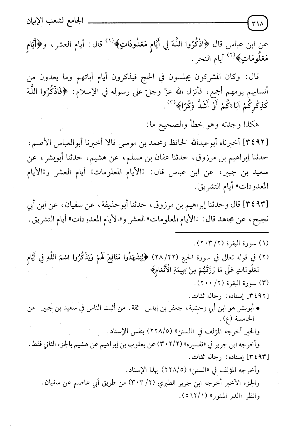 3492 - أَخْبَرَنَاهُ أَبُو عَبْدِ اللهِ الْحَافِظُ، وَمُحَمَّدُ بْنُ مُوسَى، قَالَا: أَخْبَرَنَا أَبُو الْعَبَّاسِ الْأَصَمُّ، حَدَّثَنَا إِبْرَاهِيمُ بْنُ مَرْزُوقٍ، حَدَّثَنَا عَفَّانُ بْنُ مُسْلِمٍ، عَنْ هُشَيْمٍ، حَدَّثَنَا أَبُو بِشْرٍ، عَنْ سَعِيدِ بْنِ جُبَيْرٍ، عَنِ ابْنِ عَبَّاسٍ، قَالَ: " §الْأَيَّامُ الْمَعْلُومَاتُ أَيَّامُ الْعَشْرِ، وَالْأَيَّامُ الْمَعْدُودَاتُ أَيَّامُ التَّشْرِيقِ "