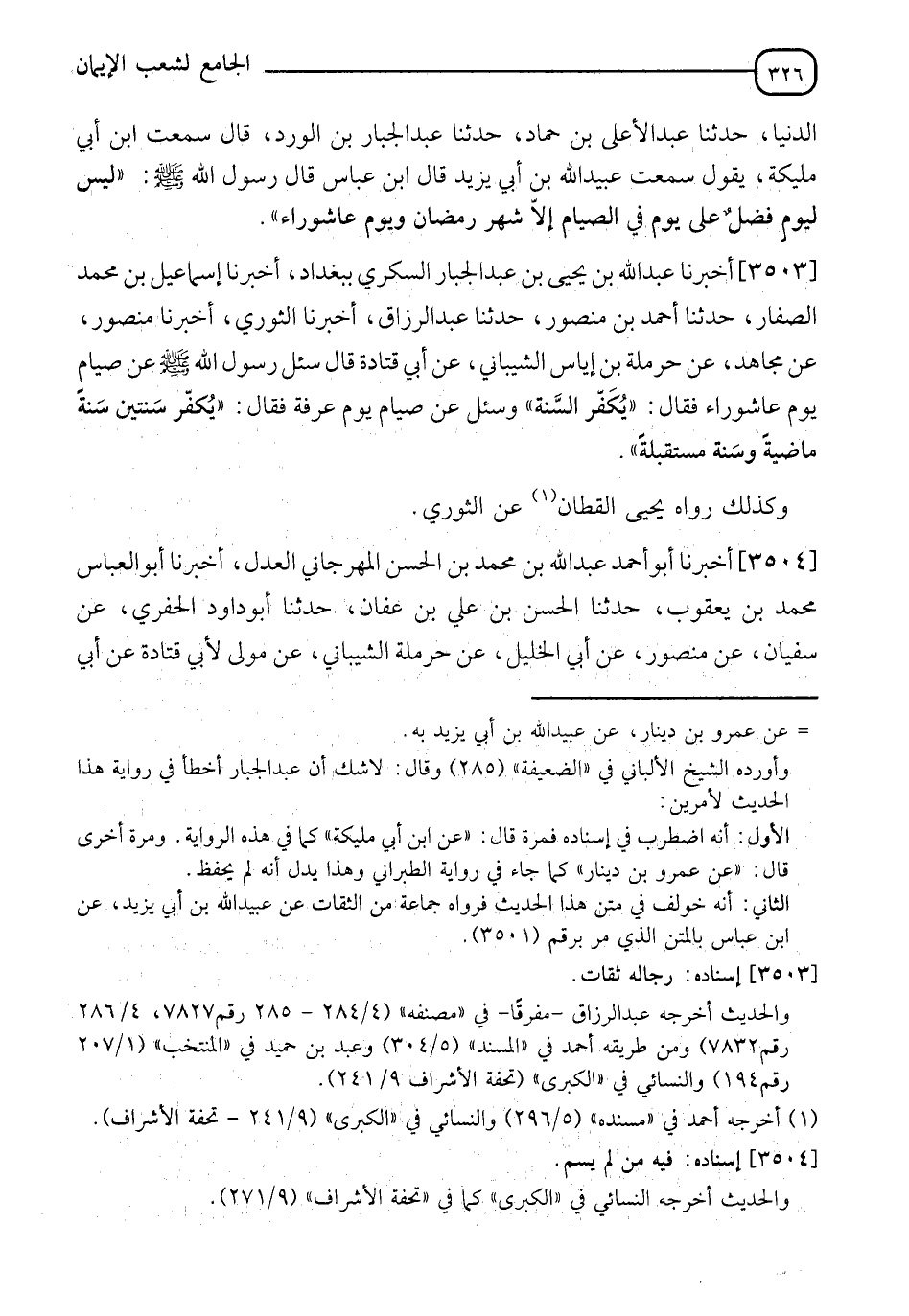 3503 - أَخْبَرَنَا عَبْدُ اللهِ بْنُ يَحْيَى بْنِ عَبْدِ الْجَبَّارِ السُّكَّرِيُّ، بِبَغْدَادَ، أَخْبَرَنَا إِسْمَاعِيلُ بْنُ مُحَمَّدٍ الصَّفَّارُ، حَدَّثَنَا أَحْمَدُ بْنُ مَنْصُورٍ، حَدَّثَنَا عَبْدُ الرَّزَّاقِ، أَخْبَرَنَا الثَّوْرِيُّ، أَخْبَرَنَا مَنْصُورٌ، عَنْ مُجَاهِدٍ، عَنْ حَرْمَلَةَ بْنِ إِيَاسٍ الشَّيْبَانِيِّ، عَنْ أَبِي قَتَادَةَ، قَالَ: سُئِلَ رَسُولُ اللهِ صَلَّى اللَّهُ عَلَيْهِ وَسَلَّمَ عَنْ §صِيَامِ يَوْمِ عَاشُورَاءَ، فَقَالَ: " يُكَفَّرُ السَّنَةَ "، وَسُئِلَ عَنْ صِيَامِ يَوْمِ عَرَفَةَ، فَقَالَ: " يُكَفَّرُ سَنَتَيْنِ، سَنَةً مَاضِيَةً وَسَنَةً مُسْتَقْبَلَةً ". وَكَذَلِكَ رَوَاهُ يَحْيَى الْقَطَّانُ، عَنِ الثَّوْرِيِّ