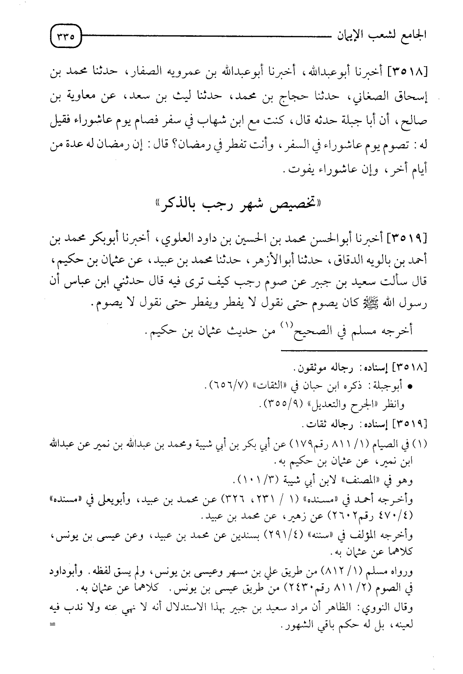 3519 - أَخْبَرَنَا أَبُو الْحَسَنِ مُحَمَّدُ بْنُ الْحُسَيْنِ بْنِ دَاوُدَ الْعَلَوِيُّ، أَخْبَرَنَا أَبُو بَكْرٍ مُحَمَّدُ بْنُ أَحْمَدَ بْنِ بَالَوَيْهِ الدَّقَّاقُ، حَدَّثَنَا أَبُو الْأَزْهَرِ، حَدَّثَنَا مُحَمَّدُ بْنُ عُبَيْدٍ، عَنْ عُثْمَانَ بْنِ حَكِيمٍ، قَالَ: سَأَلْتُ سَعِيدَ بْنَ جُبَيْرٍ: عَنْ صَوْمِ رَجَبٍ، كَيْفَ تَرَى فِيهِ؟ قَالَ: حَدَّثَنِي ابْنُ عَبَّاسٍ: " أَنَّ رَسُولَ اللهِ صَلَّى اللَّهُ عَلَيْهِ وَسَلَّمَ كَانَ §يَصُومُ حَتَّى نَقُولَ لَا يُفْطِرُ، وَيُفْطِرُ حَتَّى نَقُولَ لَا يَصُومُ ". أَخْرَجَهُ مُسْلِمٌ فِي الصَّحِيحِ مِنْ حَدِيثِ عُثْمَانَ بْنِ حَكِيمٍ