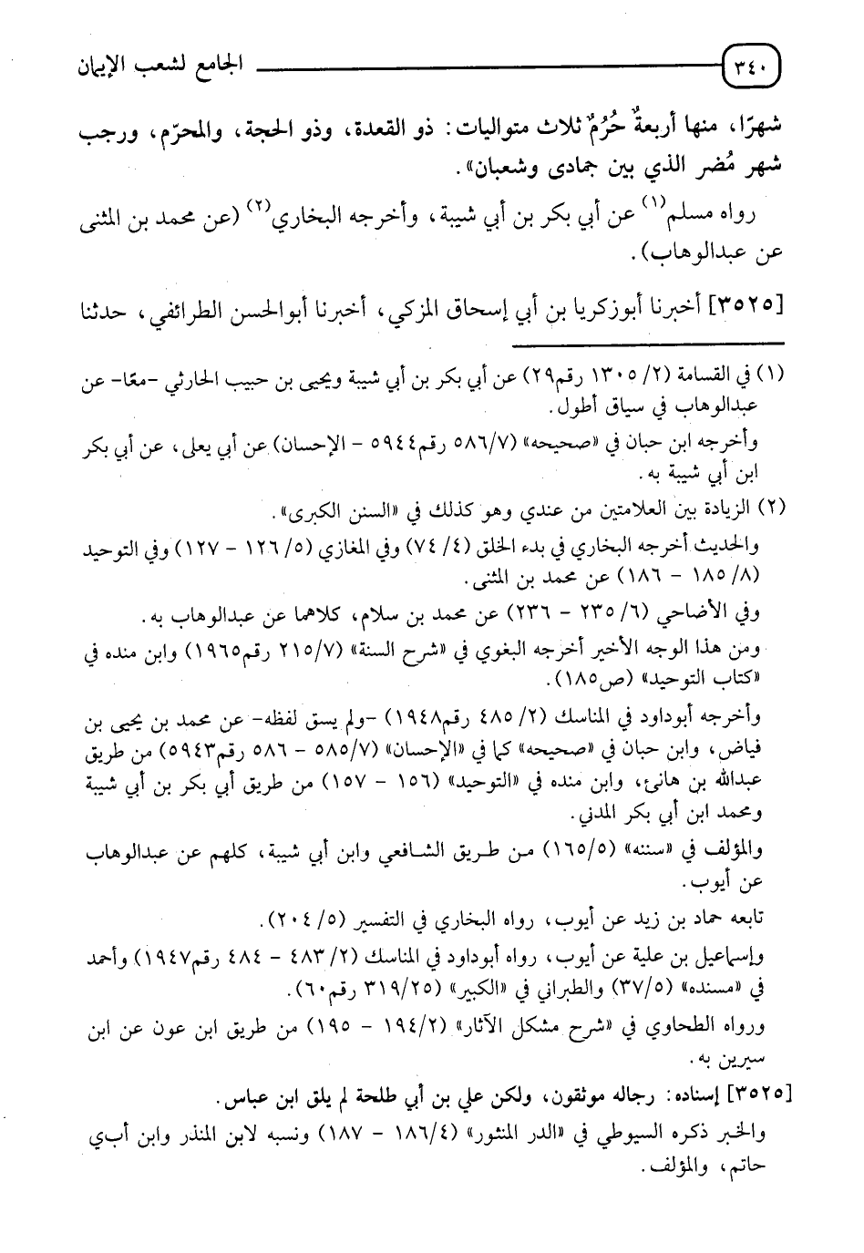3525 - أَخْبَرَنَا أَبُو زَكَرِيَّا بْنُ أَبِي إِسْحَاقَ الْمُزَكِّي، أَخْبَرَنَا أَبُو الْحَسَنِ الطَّرَائِفِيُّ، حَدَّثَنَا -[341]- عُثْمَانُ بْنُ سَعِيدٍ، حَدَّثَنَا عَبْدُ اللهِ بْنُ صَالِحٍ، حَدَّثَنِي مُعَاوِيَةُ بْنُ صَالِحٍ، عَنْ عَلِيِّ بْنِ أَبِي طَلْحَةَ، عَنِ ابْنِ عَبَّاسٍ، فِي قَوْلِهِ: {إِنَّ عِدَّةَ الشُّهُورِ عِنْدَ اللهِ اثْنَا عَشَرَ شَهْرًا فِي كِتَابِ اللهِ} [التوبة: 36] إِلَى قَوْلِهِ {مِنْهَا أَرْبَعَةٌ حُرُمٌ ذَلِكَ الدِّينُ الْقَيِّمُ فَلَا تَظْلِمُوا فِيهِنَّ أَنْفُسَكُمْ} [التوبة: 36]، قَالَ: " §لَا تَظْلِمُوا أَنْفُسَكُمْ فِي كُلِّهِنَّ، ثُمَّ اخْتَصَّ مِنْ ذَلِكَ أَرْبَعَةَ أَشْهُرٍ فَجَعَلَهُنَّ حَرَمًا، وَعَظَّمَ حُرُمَاتِهِنَّ، وَجَعَلَ الذَّنْبَ فِيهِنَّ أَعْظَمَ، وَالْعَمَلَ الصَّالِحَ بِالْأَجْرِ أَعْظَمَ "