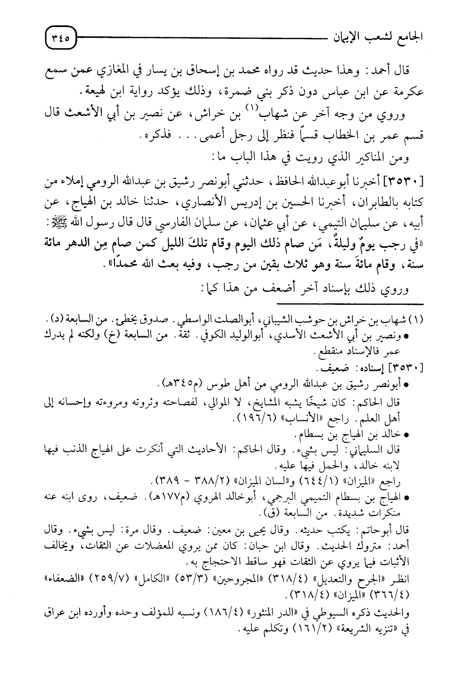 3530 - أَخْبَرَنَا أَبُو عَبْدِ اللهِ الْحَافِظُ، حَدَّثَنِي أَبُو نَصْرٍ رَشِيقُ بْنُ عَبْدِ اللهِ الرُّومِيُّ إِمْلَاءً مِنْ كِتَابِهِ بالطَّابِرانِ، أَخْبَرَنَا الْحُسَيْنُ بْنُ إِدْرِيسَ الْأَنْصَارِيُّ، حَدَّثَنَا خَالِدُ بْنُ الْهَيَّاجِ، عَنْ أَبِيهِ، عَنْ سُلَيْمَانَ التَّيْمِيِّ، عَنْ أَبِي عُثْمَانَ، عَنْ سَلْمَانَ الْفَارِسِيِّ، قَالَ: قَالَ رَسُولُ اللهِ صَلَّى اللَّهُ عَلَيْهِ وَسَلَّمَ: " §فِي رَجَبٍ يَوْمٌ وَلَيْلَةٌ مَنْ صَامَ ذَلِكَ الْيَوْمَ، وَقَامَ تِلْكَ اللَّيْلَةَ كَانَ كَمَنْ صَامَ مِنَ الدَّهْرِ مِائَةَ سَنَةٍ، وَقَامَ مِائَةَ سَنَةٍ وَهُوَ ثَلَاثٌ بَقَيْنَ مِنْ رَجَبٍ، وَفِيهِ بَعَثَ اللهُ مُحَمَّدًا "، " وَرُوِيَ ذَلِكَ بِإِسْنَادٍ آخَرَ أَضْعَفُ مِنْ هَذَا كَمَا "