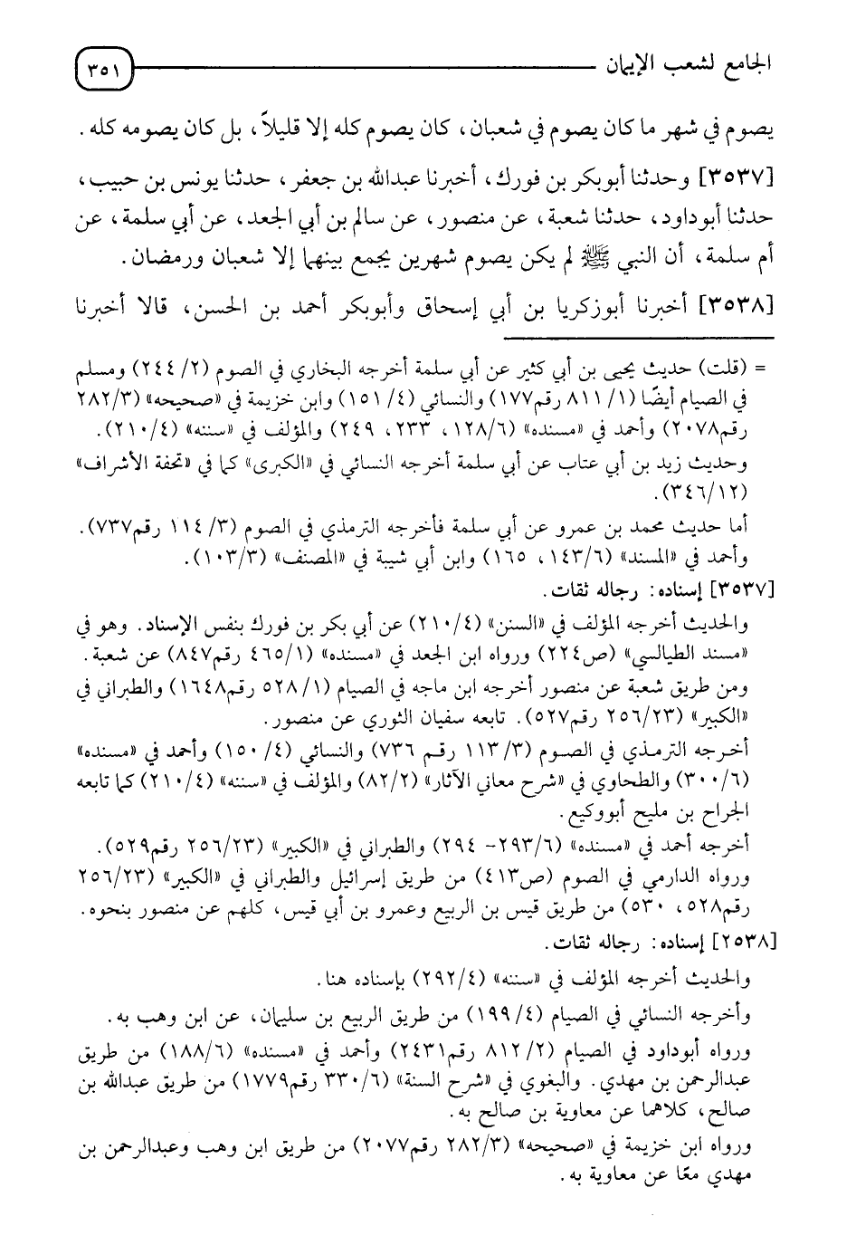 3538 - أَخْبَرَنَا أَبُو زَكَرِيَّا بْنُ أَبِي إِسْحَاقَ، وأَبُو بَكْرٍ أَحْمَدُ بْنُ الْحَسَنِ، قَالَا: أَخْبَرَنَا -[352]- أَبُو الْعَبَّاسِ مُحَمَّدُ بْنُ يَعْقُوبَ، حَدَّثَنَا بَحْرُ بْنُ نَصْرٍ، حَدَّثَنَا عَبْدُ اللهِ بْنُ وَهْبٍ، أَخْبَرَنِي مُعَاوِيَةُ بْنُ صَالِحٍ، عَنْ عَبْدِ اللهِ بْنِ أَبِي قَيْسٍ، أَنَّهُ سَمِعَ عَائِشَةَ، تَقُولُ: §" أَحَبُّ الشُّهُورِ إِلَى رَسُولِ اللهِ صَلَّى اللَّهُ عَلَيْهِ وَسَلَّمَ أَنْ يَصُومَ شَعْبَانَ ثُمَّ يَصِلُهُ بِرَمَضَانَ "